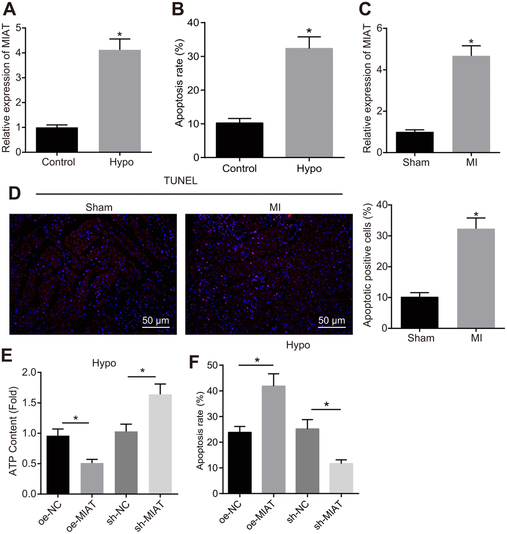 An abnormally high expression pattern of MIAT has been documented in various heart diseases [14, 15]. This study intends to further elucidate the regulatory role of MIAT in MI. First, an in vitro cardiomyocyte model of MI was established by exposure to hypoxia, where the MIAT expression pattern was determined by reverse transcription quantitative polymerase chain reaction (RT-qPCR), and the degree of apoptosis was assessed by flow cytometry. The results showed that the MIAT expression pattern (Figure 1A) and apoptosis (Figure 1B) were significantly up-regulated in the HL-1 cells after 24 h of hypoxia treatment. In the animal experiment, after 28 days of MI establishment, the cell apoptosis and MIAT expression pattern in the myocardial tissues were assessed. The results showed that the MIAT expression pattern (Figure 1C) and cell apoptosis (Figure 1D) were significantly increased in mice with MI compared with the sham-operated mice (p < 0.05). To further investigate the effects of MIAT on cardiomyocytes, we overexpressed or knocked down MIAT in the hypoxic cardiomyocytes to evaluate the effect of MIAT at the cellular level. Acknowledging that the normal function of cardiomyocytes is dependent on mitochondria-associated energy metabolism [21], the measurement of cellular ATP was conducted in an attempt to assess the function of cardiomyocytes. As shown in Figure 1E, 1F, the ATP content of the hypoxic cardiomyocytes was significantly lowered and the apoptosis of hypoxic cardiomyocytes was increased by overexpressing MIAT, both of which were contrasting in the hypoxic cardiomyocytes transfected with sh-MIAT (Figure 1G, p < 0.05). Therefore, our findings revealed that the MIAT expression pattern was significantly increased in cardiomyocytes under hypoxic condition and the knockdown of MIAT reduced the injury to cardiomyocytes caused by hypoxia treatment.