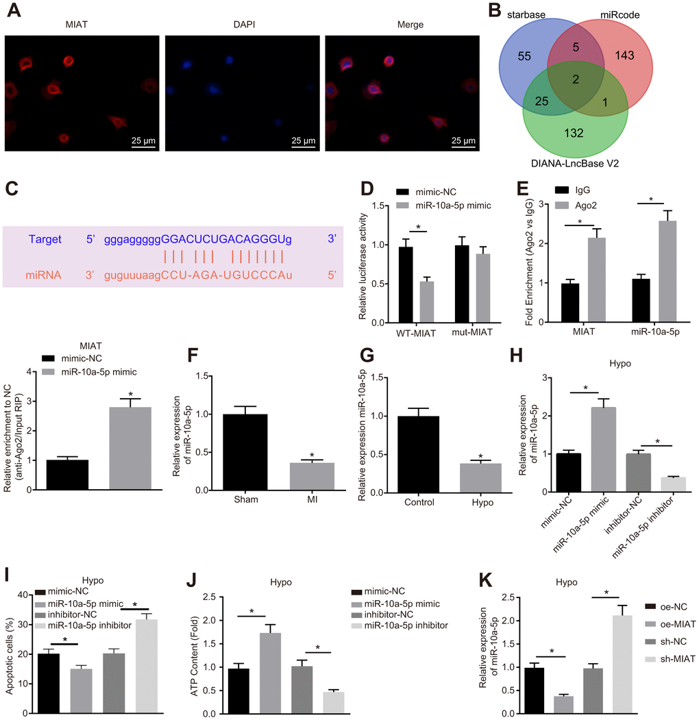 To further study the regulatory mechanism of MIAT, fluorescence in situ hybridization (FISH) was conducted with the results demonstrated that MIAT was predominantly localized in the cytoplasm (Figure 2A). Existing reports have illustrated that MIAT can competitively bind to miRNA [16, 17]. In our study, a combination of the Starbase, miRcode, and DIANA-LncBase V2 databases were employed to predict the downstream miRNAs of MIAT, which revealed two intersection miRNAs, miR-10a-5p and miR-10a-5p, among the miRNAs obtained from the three databases (Figure 2B). Prior research proposed that miR-10a might be of significant functionality in the regulation of cardiac function after MI [19]. Specific binding sites between MIAT and miR-10a-5p were obtained (Figure 2C). To validate this result, dual-luciferase reporter assay was performed. The results revealed that in the normal cardiomyocytes, the luciferase activity of the cells co-transfected with miR-10a-5p mimic and wild type (WT)-MIAT significantly decreased (p < 0.05) but no significant difference was observed in the luciferase activity of the cells co-transfected with mutant (MUT)-MIAT, indicating the ability of MIAT to specifically bind to miR-10a-5p (Figure 2D). In addition, the RNA immunoprecipitation (RIP) experiments revealed that the MIAT and miR-10a-5p enrichment in the cells incubated with anti-Ago2 significantly increased compared to the cells incubated with anti-IgG (Figure 2E, p < 0.05), indicating that MIAT could interact with miR-10a-5p, thus further forming a RNA-induced silencing complex. Hence, with the preceding results, we speculated that MIAT might impair the cardiomyocyte function by interacting with miR-10a-5p. To further investigate the effect of MIAT on miR-10a-5p expression pattern, the miR-10a-5p expression pattern was determined in the myocardial tissues of MI mice and hypoxic cardiomyocytes (Figure 2F). In comparison with the mice subjected to the sham operation, the miR-10a-5p expression pattern in the MI mice was significantly down-regulated (p < 0.05). In addition, the miR-10a-5p expression pattern in the cardiomyocytes decreased significantly after hypoxia treatment (Figure 2G). Then, the miR-10a-5p mimic and miR-10a-5p inhibitor were introduced into the hypoxic cardiomyocytes (Figure 2H) for further investigation on the effects of miR-10a-5p. The results uncovered that after transfection with the miR-10a-5p mimic, the apoptosis of hypoxic cardiomyocyte was diminished and the ATP synthesis was increased, while miR-10a-5p inhibitor transfection led to increased apoptosis and reduced ATP content (Figure 2I, 2J). Then, the effect of MIAT on the miR-10a-5p expression decreased was further studied in the hypoxic cardiomyocytes. Overexpression of MIAT reduced the miR-10a-5p expression pattern while silencing of MIAT increased the miR-10a-5p expression pattern (Figure 2K). Based on the above results, it can be conferred that MIAT induced the apoptosis of cardiomyocytes by downregulating miR-10a-5p.
