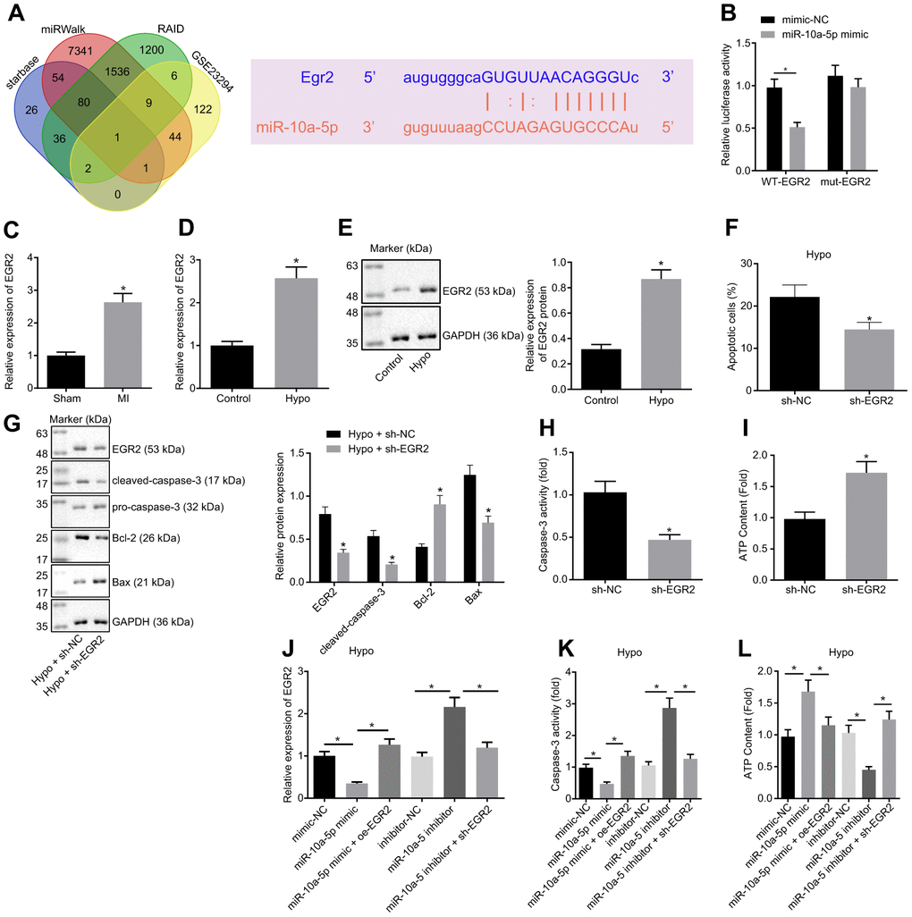 Non-coding RNAs (ncRNAs), like microRNAs (miRs) and long ncRNAs (lncRNAs), vitally principally function in muscle regulation, and have been further demonstrated as viable targets for heart disease treatment [4]. LncRNAs have been indicated to serve as biomarkers of several cardiac ailments like cardiac hypertrophy and cardiac fibrosis [5–7]. Besides, some heart-specific lncRNAs such as Novlnc6 and Novlnc15 have been reported to be implicated in maladaptive remodelling, cardiac function and possibly cardiac regeneration post-MI [8]. As a non-coding functional RNA with five exons, myocardial infarction-associated transcript (MIAT), located at 22q12.1 with a length of 30,051 bp, is closely associated with MI manifestation [9, 10]. Intriguingly, this particular lncRNA has recently been speculated to function as a diagnostic marker for acute MI [11, 12]. The significance of myocardial MIAT has been identified in other heart diseases as well. A recent study elicited that MIAT is highly expressed in the angiotensin II-treated cardiomyocytes, and down-regulation of MIAT suppresses angiotensin II-induced cardiac hypertrophy by regulation of the miR-93/Toll-like receptor 4 axis [13]. MIAT expression was aberrantly elevated in cardiac diseases like cardiomyopathy and cardiac fibrosis [14, 15], suggesting the potential functionality of MIAT in cardiac disorders. However, the mechanism by which MIAT functions in MI has not been particularly identified yet. Existing studies have proposed that MIAT could competitively bind to miRNAs to up-regulate the gene expression [16, 17]. Additionally, lncRNA-miRNA interaction prediction by a combination of Starbase, miRcode, and DIANA-LncBase V2 prior to our study identified the presence of a specific binding relation between MIAT and miR-10a-5p. A poor miR-10a-5p expression is a tangible risk factor for hypertension [18], an acclaimed risk factor of MI. Also, a study has elucidated that miR-10a may impact the cardiac function after MI [19]. Additionally, early growth response gene-2 (EGR2) has been identified to be pro-apoptotic that can be repressed by miR-150, thus further protecting the cardiac muscle from detrimental ischemic injury [20]. Interestingly, bioinformatics analysis of our study also identified a potential binding relationship between miR-10a-5p and EGR2. Conjointly, from the aforementioned literature, it is hypothesized that the interaction among MIAT, EGR2, and miR-10a-5p may participate in the progression of MI. Therefore, our study was designed to investigate the regulatory role of MIAT in MI with the involvement of miR-10a-5p and EGR2.