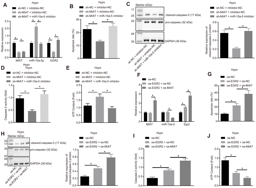 Our results demonstrated the interaction between MIAT/miR-10a-5p and miR-10a-5p/EGR2. It was speculated that MIAT might function as a regulator of EGR2-mediated apoptosis by competitively binding to miR-10a-5p. To further validate this hypothesis, the expression patterns of MIAT, miR-10a-5p and EGR2 were determined after inhibition of MIAT and miR-10a-5p in the cardiomyocytes under hypoxic conditions (Supplementary Figure 1A). In comparison with the silencing of MIAT alone, silencing both miR-10a-5p and MIAT simultaneously increased the EGR2 expression pattern in the cardiomyocytes under hypoxic conditions (Figure 4A), promoted apoptosis (Figure 4B), cleaved caspase-3 expression pattern (Figure 4C) and caspase-3 activity (Figure 4D), and decreased the ATP content (Figure 4E) (all p < 0.05). Therefore, MIAT increased the EGR2 expression pattern to subsequently induce apoptosis by reducing miR-10a-5p in in vitro hypoxia model.