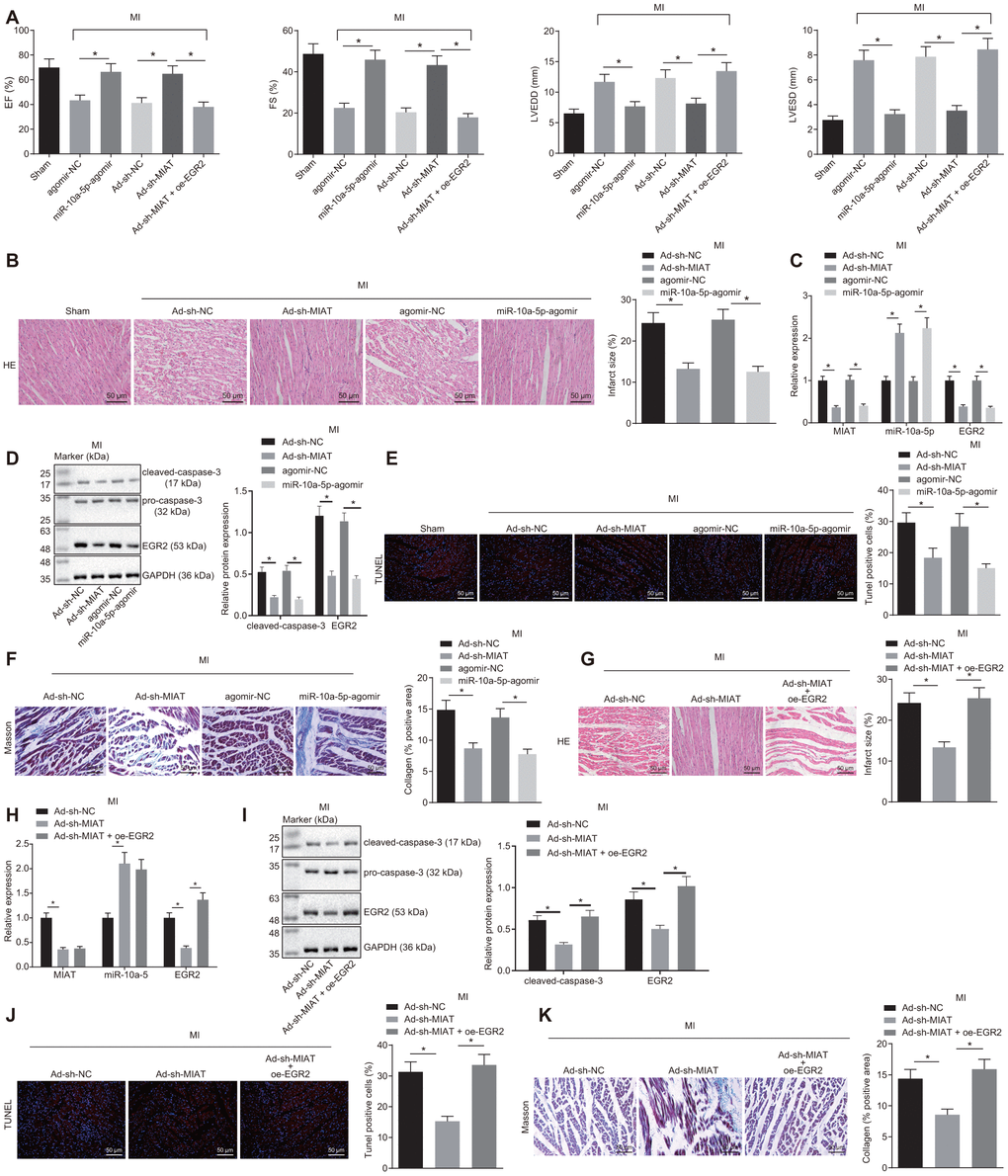 A mouse MI model was established to validate the role of the MIAT/miR-10a-5p/EGR2 axis in vivo. In light of the relevant studies that suggested changes in the expression patterns of MIAT and EGR2 after MI [13, 20], the mouse serum and myocardial tissue samples were collected after 28 days to explore the effect of MIAT and EGR2 on MI in vivo. Prior to the MI modeling, the mice were pre-injected with Ad-sh-MIAT, miR-10a-5p-agomir, Ad-oe-EGR2, or their negative controls via the tail vein. Cardiac function was assessed using animal echocardiography (Figure 5A). Left ventricular end-diastolic diameter (LVEDD), left ventricular end-systolic diameter (LVESD), left ventricular short-axis ejection fraction (EF), and shortening score (FS) were reflected by two-dimensional and M-mode echocardiography to evaluate the movement of the ventricular wall and functioning of the left ventricle. The results demonstrated that LVEDD and LVESD of the mice treated with miR-10a-5p-agomir were significantly lowered while the EF and FS were significantly elevated (Figure 5A). This indicated that up-regulation of miR-10a-5p improved cardiac function after MI. Instead, compared with the mice injected with the Ad-sh-MIAT, LVEDD and LVESD values of the mice injected with Ad-sh-MIAT + oe-EGR2 increased significantly, and EF and FS values decreased significantly (p < 0.05, Figure 5A), indicating that overexpression of EGR2 aggravated the cardiac dysfunction of mice after MI. In addition, hematoxylin-eosin (HE) staining showed infarcted myocardial tissues in MI mice (Figure 5B). The myocardial infarct size decreased in mice injected with Ad-sh-MIAT or miR-10a-5p-agomir, indicative of MI symptom alleviation. The expression patterns of MIAT, miR-10a-5p and EGR2 and the apoptosis indicators (Figure 5C–5E) were also determined. Our results presented that in mice injected with Ad-sh-MIAT or miR-10a-5p-agomir, MIAT, EGR2 and cleaved caspase-3 expression patterns and the number of apoptotic cells were significantly decreased, while the miR-10a-5p expression pattern increased. Masson staining showed that either silence of MIAT or overexpression of miR-10a-5p reduced the collagen deposition (Figure 5F). Additionally, in order to verify that EGR2 is an effector molecule of the MIAT/miR-10a-5p axis, the mice were injected with Ad-sh-MIAT and Ad-oe-EGR2. In comparison with the Ad-sh-MIAT injection group, the myocardial infarct size was significantly increased when the mice were injected with both Ad-sh-MIAT and oe-EGR2 (Figure 5G). The treatment with Ad-sh-MIAT and Ad-oe-EGR2 resulted in increased expression patterns of EGR2 (Figure 5H) and cleaved-caspase-3 (Figure 5I), and enhanced cardiomyocyte apoptosis (Figure 5J) and collagen deposition (Figure 5K) relative to the treatment with Ad-sh-MIAT alone. The aforementioned results suggested that silencing of MIAT improved cardiac function in mice after MI by downregulating miR-10a-5p-targeted EGR2.