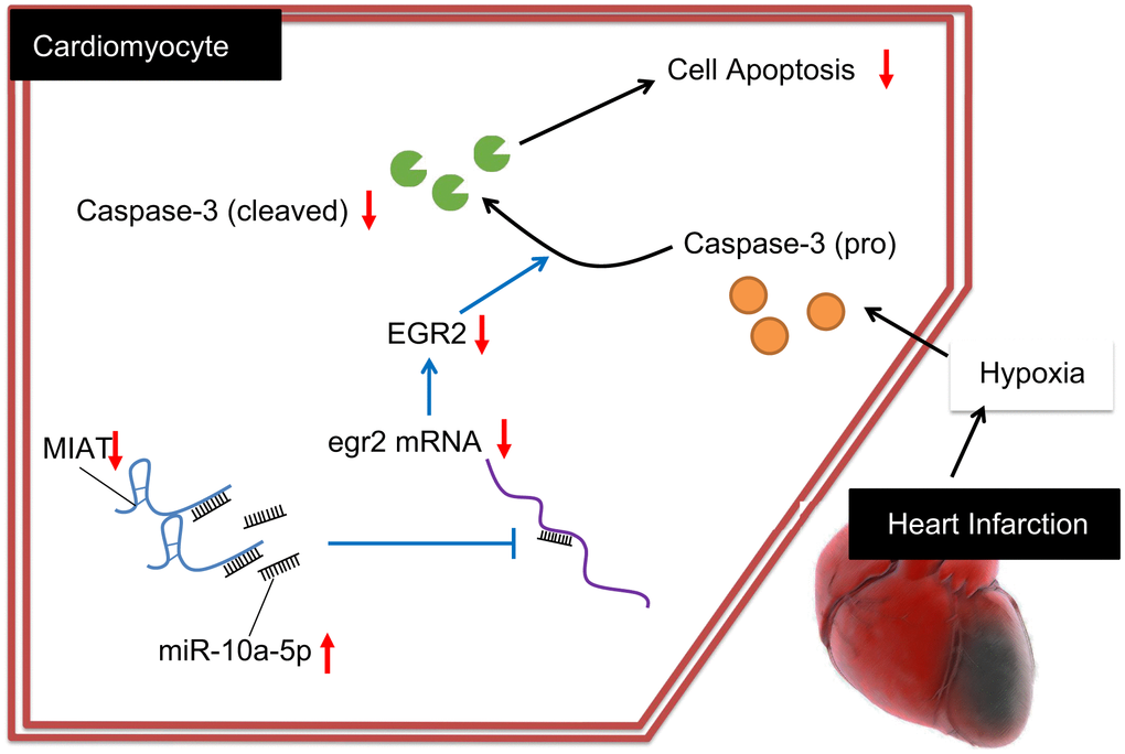 Collectively, our data exhibited MIAT up-regulation in MI. Moreover, MIAT silencing conferred a protective role against cardiomyocyte apoptosis via miR-10a-5p-dependent inhibition of EGR2 (Figure 6). Hence, from the aforementioned literature, it can be elucidated that the inhibition of MIAT could serve as a promising therapeutic method for treating MI by alleviating the myocardial injuries. However, the interaction of miRNA and lncRNA is an intriguing and significant research topic, and the underlying rules warrant further investigation for effective therapeutic modalities of cardiac diseases.