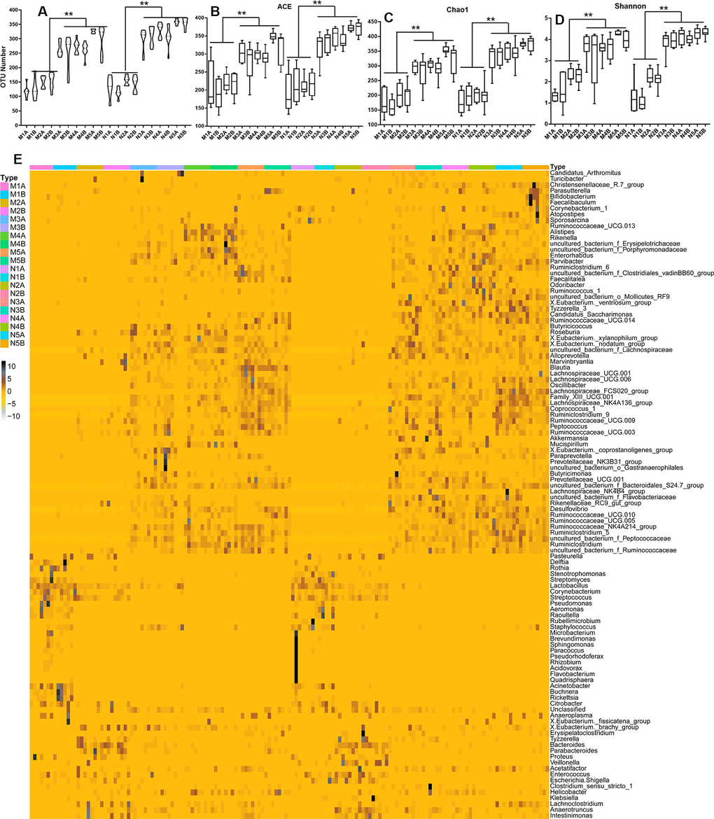 To study the impact of the maternal diet during pregnancy on the growth, development, health, and disease of the offspring, we compared the microbiota in fimo at different growth phases, or from mothers fed on different diets during pregnancy, at least eight samples for each subgroup. The alpha diversity (Figure 1 and Supplementary Figures 1A–1F, 2A, 2C, 3) and the beta diversity (Supplementary Figures 2B, 2D, 3A–3G) could be distinguished between each of the standard diet, high sugar and high fat diet (HSHF), and dietary supplement groups. We first analyzed the constitutive changes between the standard diet groups: the number of operational taxonomic units (OTU) increased from low (35) to high (253) as the offspring grew up (Figure 1A and Supplementary Figures 1, 4A–4G), while the quantity variance between individuals decreased (Supplementary Figure 4A–4G). This indicated that the composition of the gut microbiota became more stable from birth to adulthood, the abundance of bacteria increased, and individual differences gradually decreased. Principal component analysis (PCA) showed that the 7- (N1) and 14- (N2) day samples could be successfully distinguished from the 21- (N3), 28- (N4), and 56- (N5) day samples; after 21 days of age, the differences became smaller (Supplementary Figure 3). The HSHF groups from the different growth phases (at 7 (M1), 14 (M2), 21 (M3), 28 (M4), and 56 (M5) days of age) showed the same variation tendency (Supplementary Figures 2A–2D, 4A–4G).