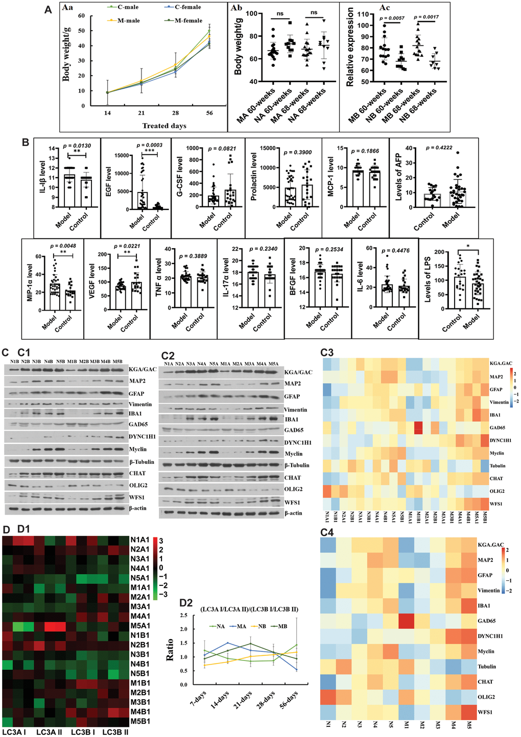 The antibody of KGA/GAD (Proteintech, 12855-1-AP, 1:600), MAP2 (Proteintech, 17490-1-AP, 1:1000), GFAP (Proteintech, 20746-1-AP, 1:2000), vimentin (Proteintech, 10366-1-AP, 1:5000), IBA1 (Proteintech, 10904-1-AP, 1:1000), GAD65 (Proteintech, 20746-1-AP, 1:1000), DYNC1H1 (Proteintech, 12345-1-AP, 1:1000), myelin (Proteintech, 10458-1-AP, 1:3000), tubulin (Abcam, ab7291, 1:10000), CHAT (Proteintech, 207471-1-AP, 1:1000), OLIG2 (Proteintech, 13999-1-AP, 1:400), WFS1 (Proteintech, 11558-1-AP, 1:600), LC3A (CST, 4599S, 1:5000), LC3B (CST, 3868S, 1:5000), ACEh (Proteintech, 17975-1-AP, 1:1000), Amp (Proteintech, 13379-1-1P, 1:2000), CHRNA1 (Proteintech, 10613-1AP, 1:1000), CHRNB1 (Proteintech, 11553-1-AP, 1:1000), Tau (Affinity, AF6141, 1:1000), p-Tau (CST, 11837S, 1:1000), APOE (Absic, 5841, 1:1000), CD33 (Absic, AB32577, 1:1000), TREM2 (Abcam, ab86491, 1:500), LHX8 (Affinity, DF6778, 1:1000), PSD95 (Affinity, AF5283, 1:1000) and NF-κB (Abcam, 16502, 1:1000), MAOA (Proteintech, 10539-1-AP, 1:1000), MAOB (Proteintech, 12602-1-AP, 1:1000), and COMT (Proteintech, 14754-1-AP, 1:500) were measured.