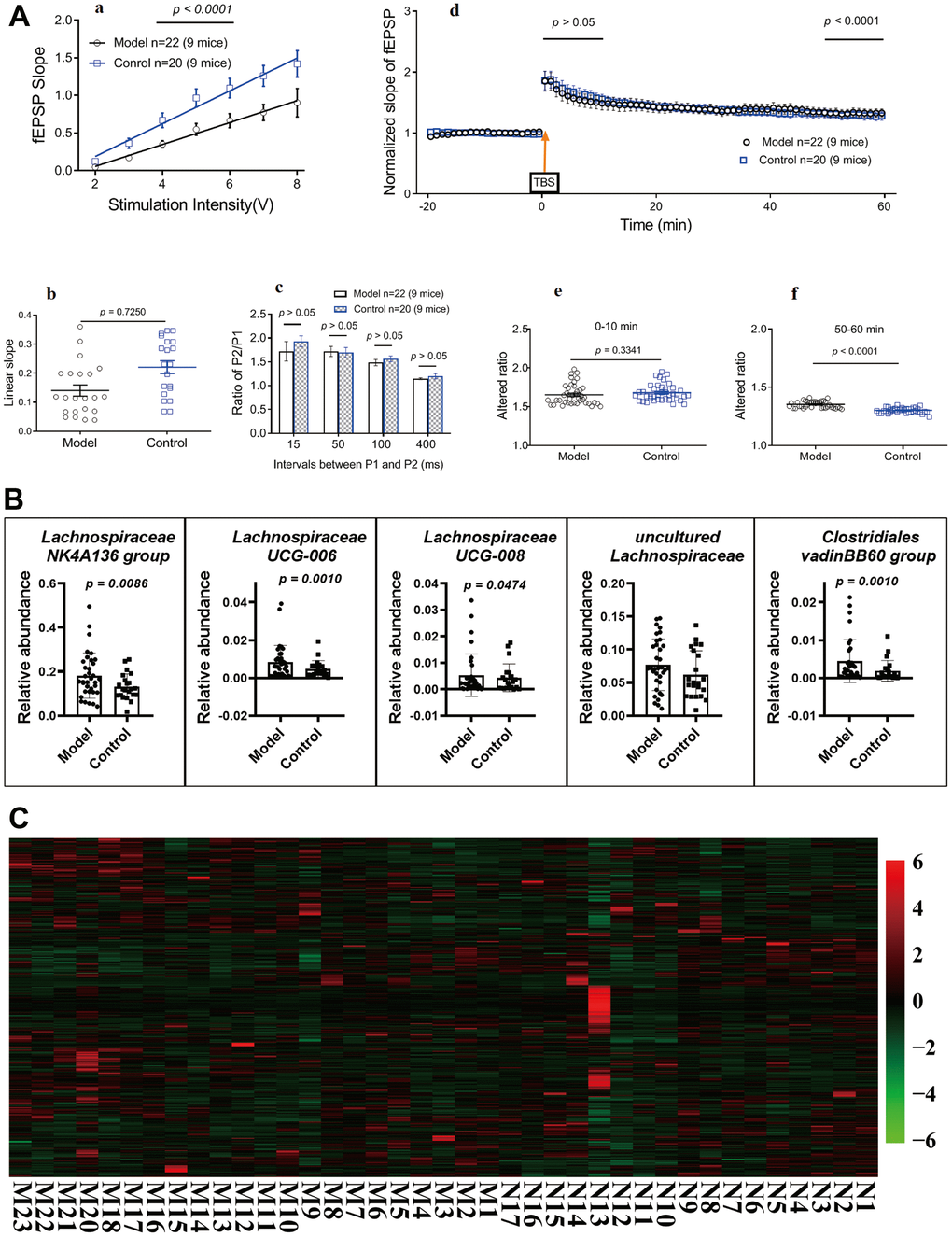 After ten months, subsets of mice were randomly selected to perform standard field potential recordings. Repetitive stimulation (0.33 Hz) of Schaffer collaterals evoked fEPSPs in the hippocampal CA1 region (Figure 3Aa; p < 0.05). The input–output relationship curves (Figure 3Ab; p > 0.05) and linear slopes (Figure 3Ac; p > 0.05) revealed that compared to control mice (standard-diet mice, control; HSHF-diet mice, model), the hippocampal CA1 neurons of model mice showed no differences. Synaptic short-term plasticity was measured using a PPF protocol in hippocampal slices. Statistical analyses of data from all slices demonstrated an inhibition of the ratio of P2/P1 at all tested P1 and P2 intervals in model mice compared to control mice (Figure 3Ad; p > 0.05), suggesting HSHF-diet no impaired hippocampal synaptic short-term plasticity. Finally, hippocampal CA1 synaptic LTP were compared between model and control mice. Plotting of the recording time to normalized fEPSP slopes (baseline set as 1) from pooled data showed impaired LTP induction (after theta-burst stimulation at 0–10 min) and maintenance (after theta-burst stimulation at 50–60 min) in all treated groups (Figure 3Ae- p > 0.05, unpaired t test). The mean LTP induction results are shown in Figures 3Ad and f (p < 0.05, unpaired t test). This suggests that consuming a HFHS diet before and during pregnancy could improve LTP in the offspring and suggests that the gut microbiota may play an important role.