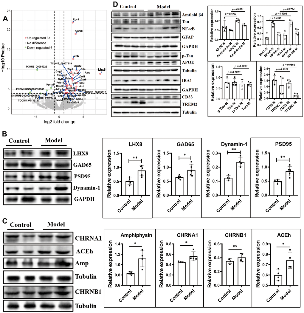 L3/Lhx8 is involved in the determination of cholinergic or GABAergic cell fate [27]. The mRNA sequence results showed that expression of Lhx8 (Figure 4A and Table 1; p < 0.05) and the LHX8 protein (Figure 4B, p < 0.05) were upregulated. Cholinergic and GABAergic cells regulated by this protein showed upregulated levels of the marker proteins ACEh, Amp, CHRNA1, CHRNB1, and GAD65 (Figure 4B, 4C, p < 0.05).
