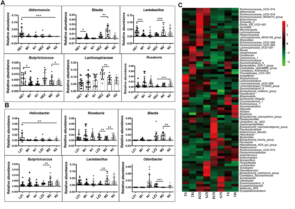 The use of specific dietary supplements (Hericium erinaceus and Ganoderma lucidum) during pregnancy changed the inheritance of microorganisms (Supplementary Figures 2A, 2B). In addition, exposure to different microorganisms in early life from the outdoor soil (T-) and from SAMP8 mice (S-) also changed the inherent abundances of different species (Supplementary Figures 2C, 2D).