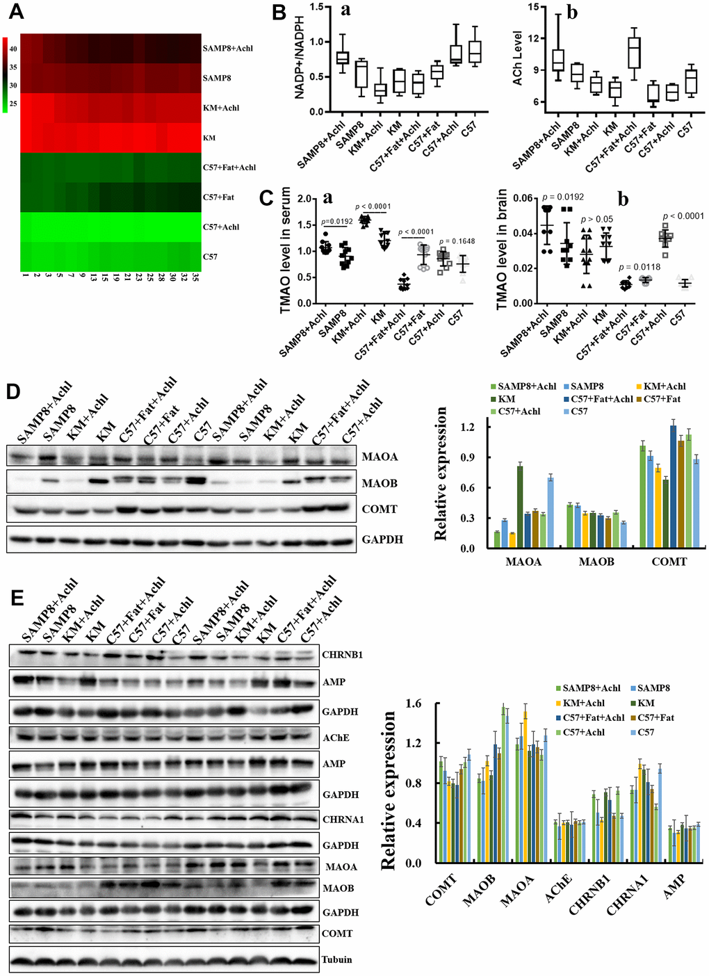 The cholinergic hypothesis plays an important role in AD therapy. To investigate the role of the gut microbiota on the conversion rate of choline, 50 mg/kg/d choline was fed to mice with different gut microbiota, including SAMP8 mice, KM mice, C57 mice, and HSHF-diet mice (at 5 weeks of age). As shown in Figure 6, body weight was slightly lowered after treatment with choline (Figure 6A), and levels of acetylcholine (Figure 6B; p < 0.05) and NADPH/NADP+ (Figure 6B; p < 0.05) were also changed. In addition, TMAO levels in serum (Figure 6Ca) and in brain tissue (Figure 6Cb) were changed, especially in mice pre-fed the HSHF diet (p < 0.05). Expression levels of the proteins MAOA, MAOB, and COMT in liver (Figure 6D) and in brain (Figure 6E; p < 0.05) tissues were changed; in particular, choline significantly increased the levels of these proteins in the liver of SAMP8 mice (Figure 6D; p < 0.05). Expression of the proteins AChE, AMP, CHRNA1, and CHRNB1 in the brain were also affected (Figure 6E). Together, these observations indicate that the gut microbiota influence the conversion rate of choline to TMAO, and that the TMAO level influences the cholinergic system. Furthermore, the effect of a decrease in body weight was confirmed in this study.