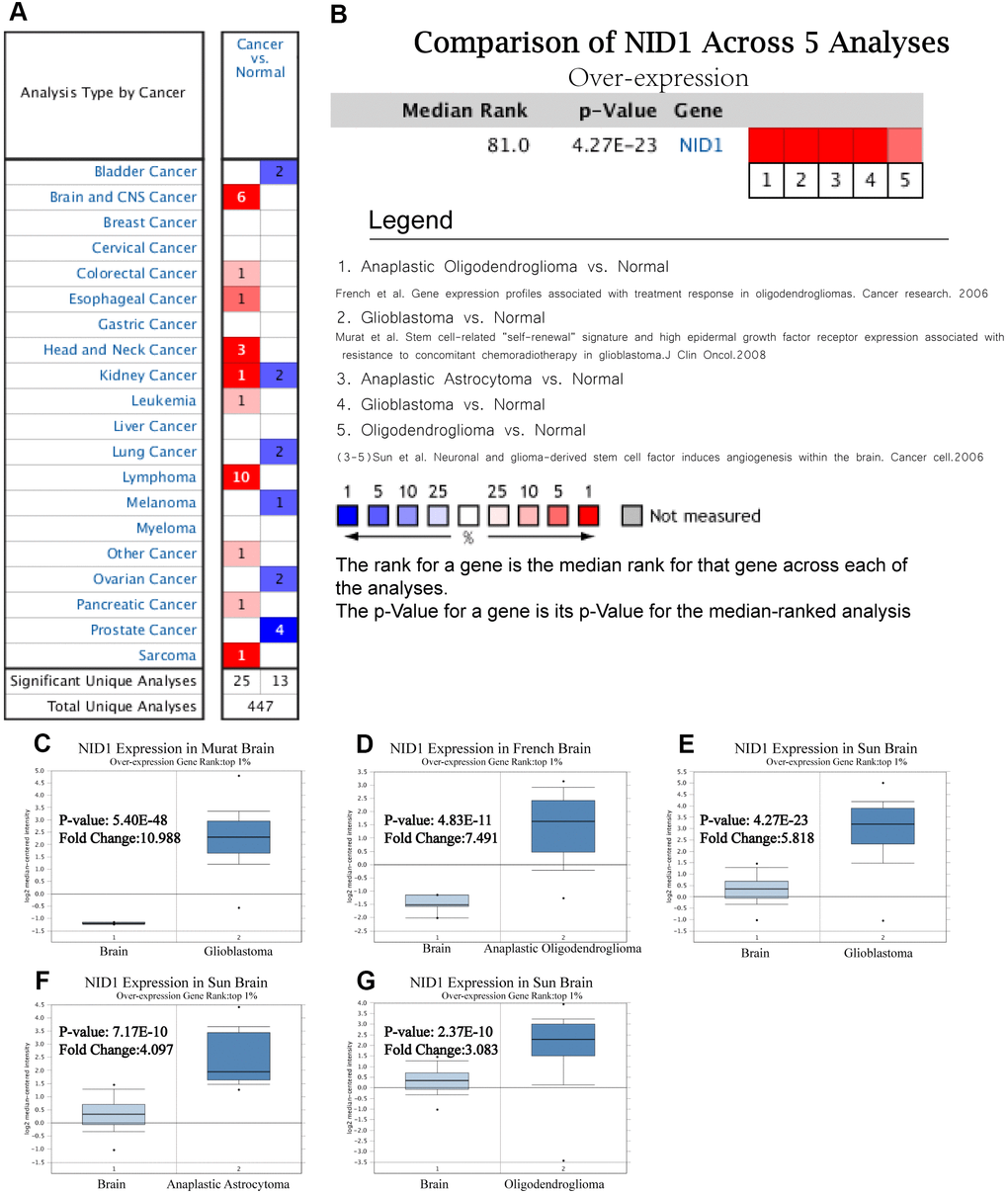 We analyzed NID1 expression in 15 different kinds of cancers using the Oncomine database with P ≤ 1E-4, fold change ≥ 2, and gene rank in the top10% as threshold parameters. NID1 expression was significantly higher in multiple cancer types compared to their corresponding normal tissues, as reported in 25 unique cancer studies including 6 studies related to brain and CNS tumors (Figure 1A). The detailed information of the 6 brain tumor-related studies is shown in Table 1. The analysis of 5 studies related to brain and CNS tumors (the sixth study was a TCGA dataset) showed that NID1 was overexpressed in brain tumor tissues compared to the corresponding normal brain tissues (Figure 1B). NID1 was significantly upregulated in glioblastoma (Murat and Sun brain datasets), anaplastic astrocytoma (Sun brain dataset), and oligodendroglioma (French and Sun brain datasets) tissues compared to the corresponding normal tissue samples (Figure 1C–1G).
