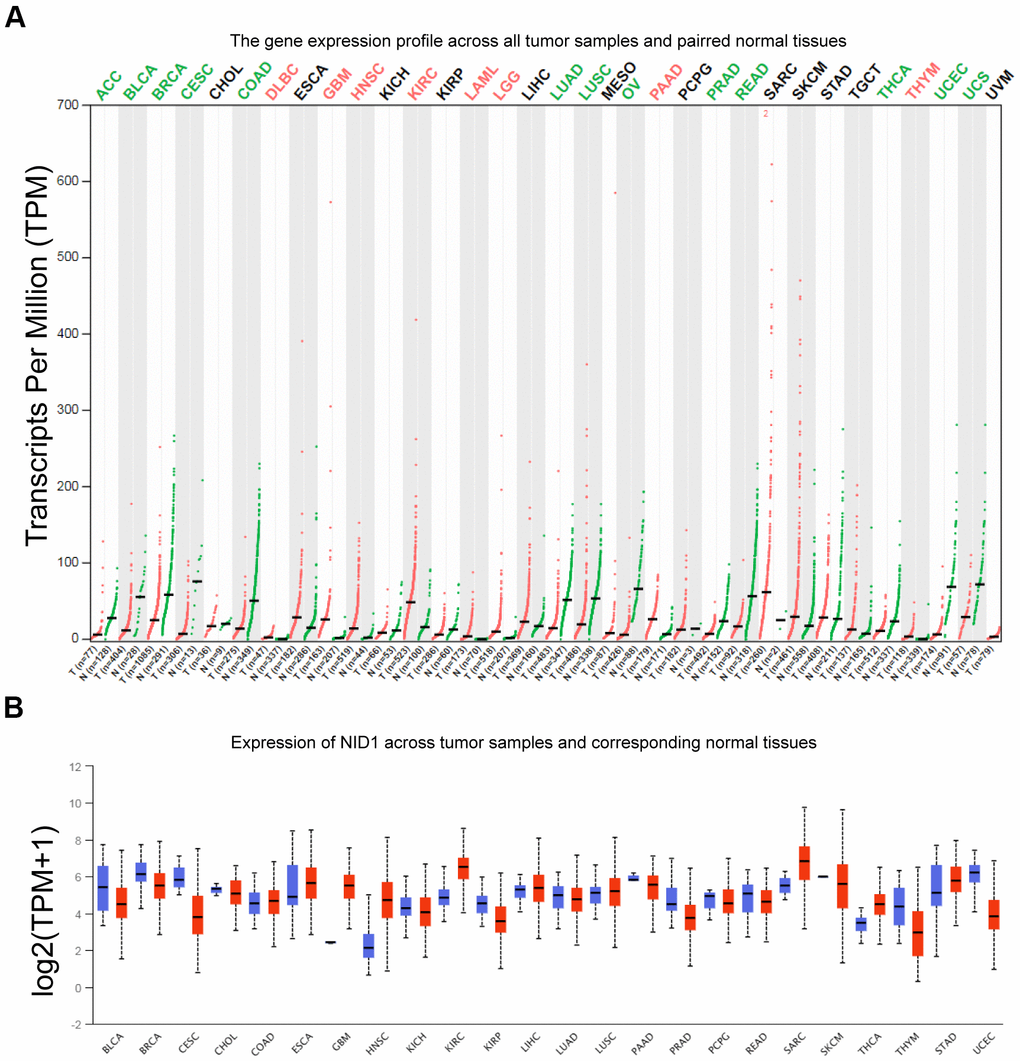 NID1 is overexpressed in several pan-cancer tissue datasets from UALCAN and GEPIA databases