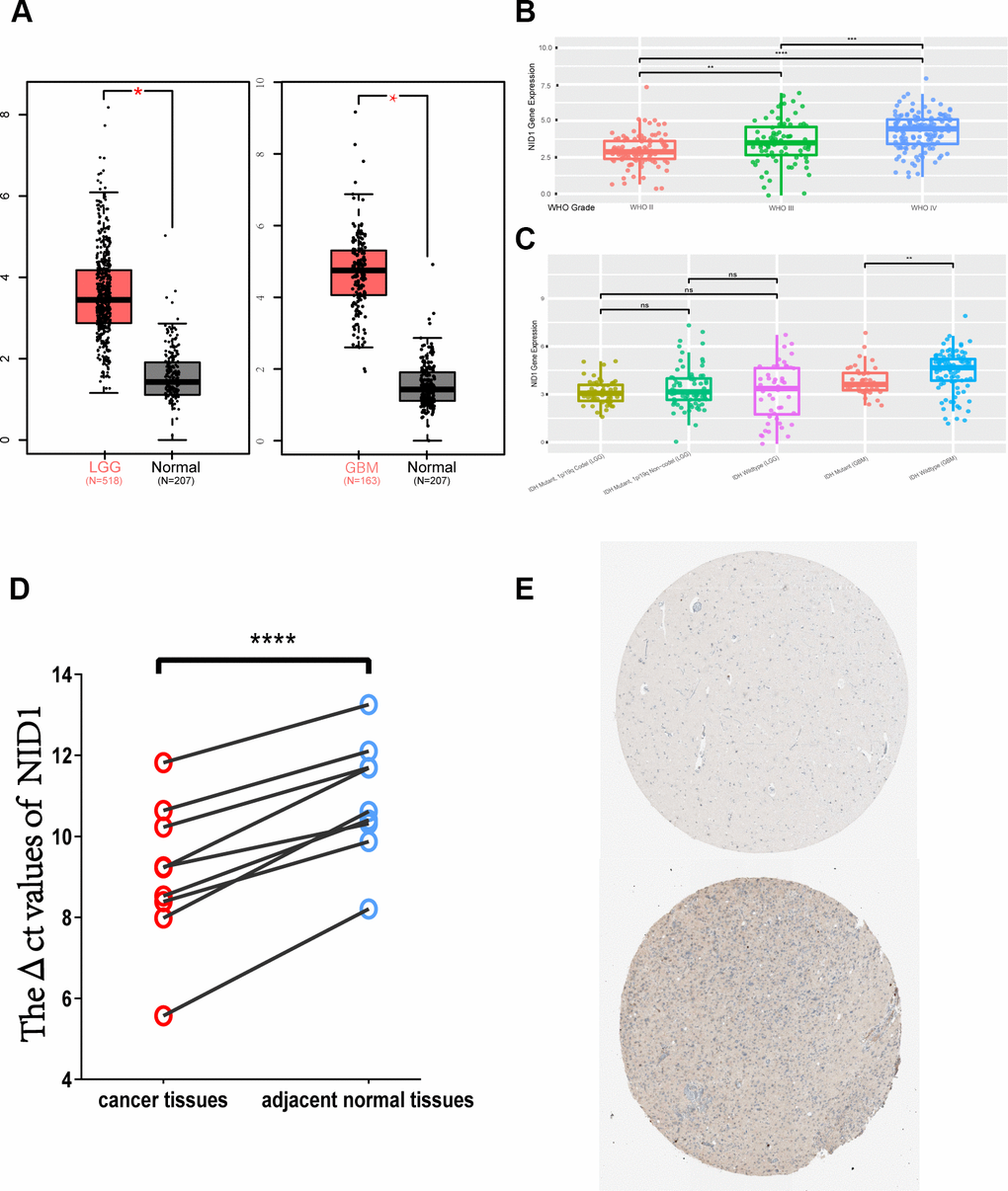 Next, we analyzed the expression of NID1 in various grades of gliomas. According to the World Health Organization (WHO) criteria, gliomas are classified into four grades—WHO grades I, II, III, and IV [19]. WHO grades I, II, and III are collectively called as low-grade gliomas (LGG), whereas, WHO grade IV is called glioblastoma multiforme (GBM) and is the most malignant type of glioma [20, 21]. GEPIA database analysis showed that NID1 transcript expression in the LGG and GBM tissues was significantly higher compared to the normal brain tissues (Figure 3A). CGGA database analysis also showed that NID1 expression was significantly increased in the higher glioma grades (Figure 3B). Furthermore, IDH mutant GBM tissues showed significantly lower NID1 expression than the IDH wild-type GBM tissues, but NID1 expression in IDH mutant and wild-type LGG tissues was similar (Figure 3C). Furthermore, qRT-PCR analysis of 9 pairs of glioma tissues and adjacent non-tumor brain tissues (Supplementary Table 2) showed that NID1 mRNA expression was significantly higher in 100% (9/9) of glioma tissues compared to the corresponding adjacent normal brain tissues (p<0.0001; Figure 3D).