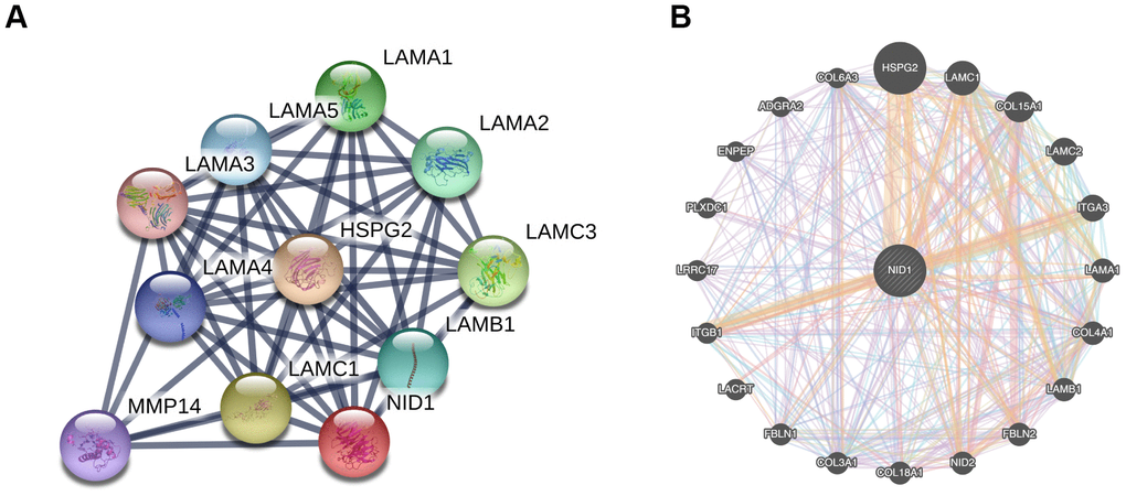 We used the STRING database to construct a protein-protein interaction (PPI) network of NID1-associated proteins that included proteins such as HSPG2, matrix metalloproteinase (MMP), and laminin subunit proteins such as LAMA1, LAMC1, LAMB1, and others (Figure 6A). Furthermore, GeneMANIA database analysis showed that NID1 interacted with NID2 (paralog of NID1), collagen subunits such as COL15A1, COL4A1, COL18A1, and COL3A1, and integrins such as ITGA3 and ITGB1, all of which were components of the basement membrane (BM) or extracellular matrix (ECM) (Figure 6B).