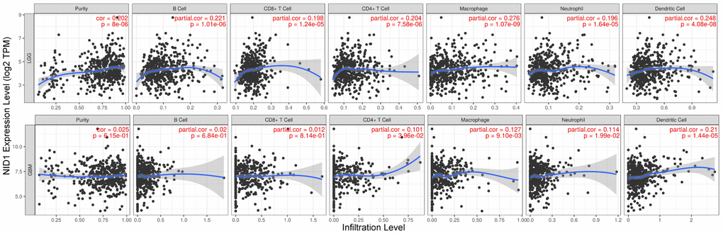 Tumor Immune Estimation Resource (TIMER) (http://cistrome.shinyapps.io/timer/) database is used to characterize association between tumor infiltration of several immune cell types and other disease-related factors including gene expression, clinical outcomes, somatic mutations, and somatic copy number alterations [81]. In this study, we analyzed the association between NID1 expression levels and infiltration status of six different immune cell types in gliomas (LGG and GBM) after adjusting for tumor purity using Spearman correlation coefficient (COR) and P-values. COR>0 indicated positive correlation and COR<0 indicated negative correlation; P <0.05 was considered statistically significant.