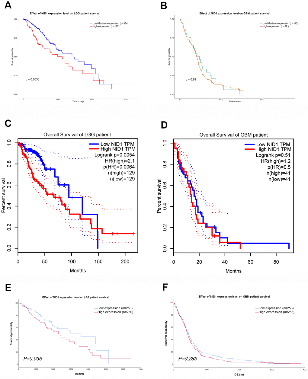 Next, we evaluated the prognostic value of NID1 expression in glioma patients from the UALCAN and GEPIA databases. Kaplan-Meier survival curve analysis showed that high NID1 expression correlated with worse overall survival of LGG patients (Figure 8A, 8C). However, we did not observe significant correlation between NID1 expression levels and overall survival of GBM patients (Figure 8B, 8D). Furthermore, we analyzed the survival data of glioma patients in the TCGA database (UCSC Xena browser) after excluding cases of tumor recurrence tumor and those without survival time. We sub-divided TCGA-glioma patients into high- and low-NID1 expression groups based on median NID1 expression levels. Kaplan–Meier survival curve analysis showed that overall survival (OS) of LGG patients with low NID1 expression was significantly higher compared to LGG patients with high NID1 expression (P = 0.035; Figure 8E). However, NID1 expression levels did not correlate with survival in GBM patients (P=0.283; Figure 8F). These results suggested that high NID1 expression was associated with worse OS in LGG patients.