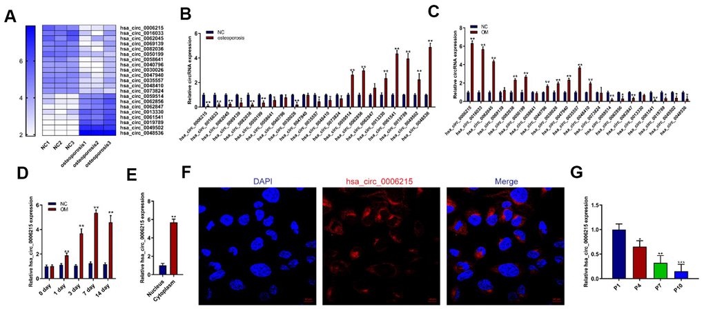 We used RNA-seq to assess the expression of circRNAs in BMSCs collected from individuals with or without OP to determine their role in senile OP. The expression of circRNA in BMSCs considerably differed between the two groups (Figure 1A). The RNA-seq results were validated by quantitative real-time polymerase chain reaction (qRT-PCR). Expression of the circRNA hsa_circ_0006215 in BMSCs from patients with OP was significantly decreased compared with the normal controls (Figure 1B). We also determined circRNA that were differentially expressed in BMSCs during osteogenic differentiation. The expression of hsa_circ_0006215 significantly increased during the osteogenic differentiation of BMSCs and peaked on the 7th day of induced osteogenic differentiation (Figure 1C, 1D). Quantitative RT-PCR using total RNA extracted from the nucleus and cytoplasm showed that hsa_circ_0006215 mainly localized in the cytoplasm (Figure 1E), which was also confirmed by results of fluorescence in situ hybridization (Figure 1F). An important cause of senile OP is aging BMSCs. Therefore, we constructed a replicative model of aging BMSCs in vitro, and found that hsa_circ_0006215 expression significantly decreased in BMSCs as the number of replications increased (Figure 1G).