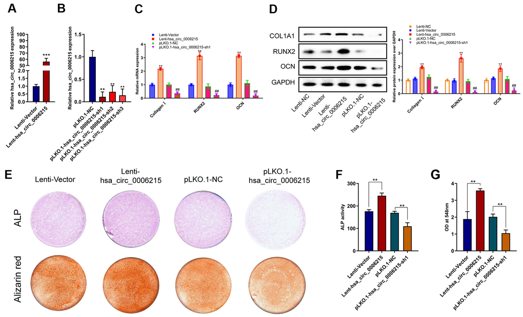 We further investigated the mechanism underlying the role of hsa_circ_0006215 in the osteogenic differentiation of BMSCs using lentiviruses to overexpress and knockdown hsa_circ_0006215 in BMSCs. The qRT-PCR results showed that hsa_circ_0006215 overexpression and knockdown significantly increased and decreased the expression of hsa_circ_0006215, respectively, in BMSCs (Figure 2A, 2B). The overexpression of hsa_circ_0006215 also enhanced expression of the osteogenesis-related genes, COL1A1, RUNX2, and OCN (Figure 2C). In contrast, the expression of these genes was decreased when hsa_circ_0006215 was knocked down (Figure 2C). Results of western blotting revealed similar findings at the protein level (Figure 2D). The quantitative findings of alkaline phosphatase (ALP) and alizarin red staining showed that hsa_circ_0006215 overexpression and knockdown significantly promoted and inhibited the osteogenic differentiation of BMSCs, respectively (Figure 2E–2G).