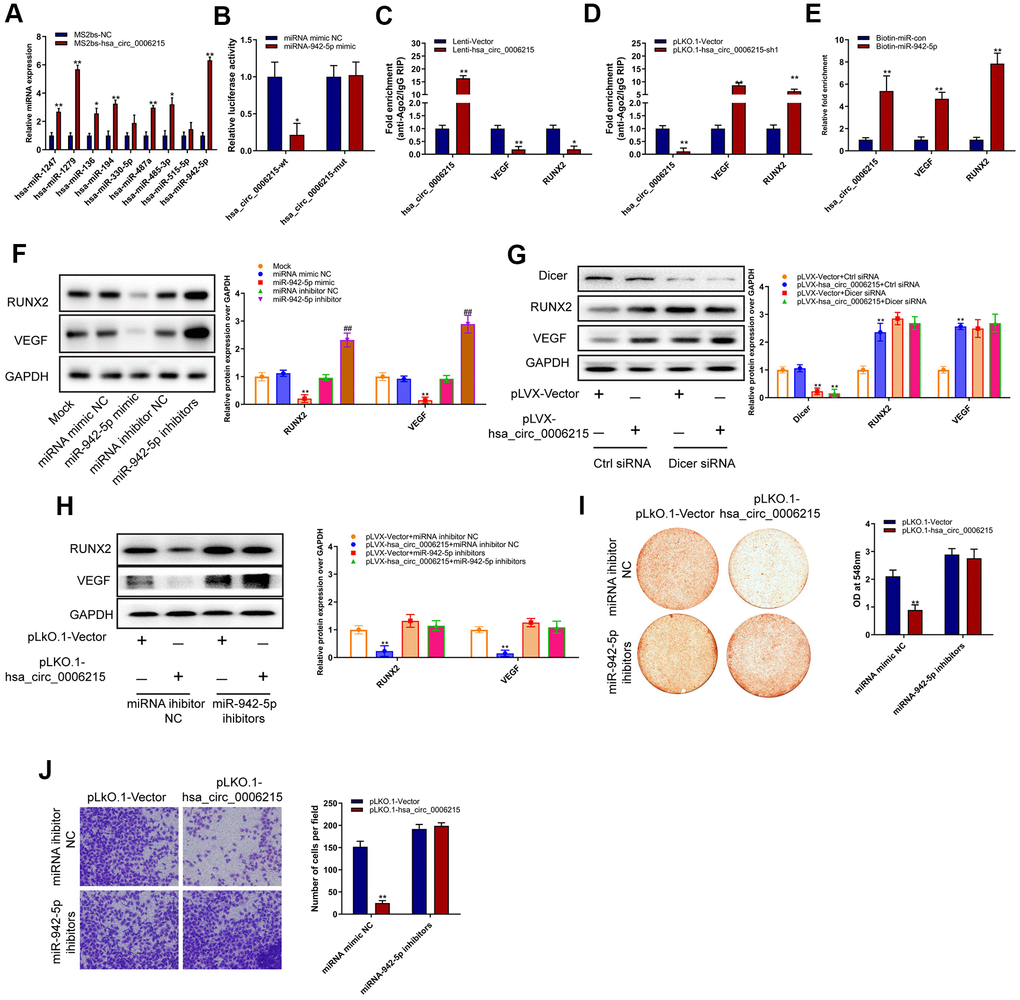 Based on our finding that hsa_circ_0006215 mainly localized in the cytoplasm, we speculated that it regulates miRNA expression via the competitive endogenous RNA (ceRNA) mechanism. We used online bioinformatics software (Circular RNA Interactome https://circinteractome.nia.nih.gov/divergent_primers.html) and found that hsa_circ_0006215 has binding sites for several miRNA. We validated this using RNA pull-down assays, in which we enriched several miRNAs by pulling them down with linearized circRNA hsa_circ_0006215; miRNAs-942-5p was the most enriched among all the miRNAs (Figure 3A). Mutations of the gene encoding hsa_circ_0006215 in the region involved in binding miRNA-942-5p did not affect luciferase activity in luciferase reporter assays; however, miRNA-942-5p significantly affected the luciferase activity of the vector carrying the wild-type hsa_circ_0006215 gene (Figure 3B). The results of TargetScan analysis showed that microRNA-942-5p bind to the RUNX2 and VEGF 3′-UTR. Ago2 RNA immunoprecipitation (RIP) assays showed that overexpressed hsa_circ_0006215 significantly inhibited the binding of Ago2 and VEGF and RUNX2, whereas inhibiting hsa_circ_0006215 expression increased that of Ago2, VEGF, and RUNX2 (Figure 3C, 3D). These results showed that miR-942-5p binds to hsa_circ_0006215, VEGF, and RUNX2 (Figure 3E). Overexpressed hsa_circ_0006215 indirectly promoted RUNX2 and VEGF protein expression by binding more miRNA-942-5p. Knocked down Dicer expression was accompanied by decreased expression of miRNA-942-5p, and reduced promotional effect of hsa_circ_0006215 on the expression of RUNX2 and VEGF, indicating miR-942-5p dependence (Figure 3G). Inhibition of hsa_circ_0006215 expression decreased expression of RUNX2 and VEGF, and inhibiting miRNA-942-5p function decreased the regulatory effects of hsa_circ_0006215 on the expression of RUNX2 and VEGF (Figure 3H). Inhibiting hsa_circ_0006215 expression decreased BMSCs osteogenesis, whereas inhibiting miRNA-942-5p minimized this decrease (Figure 3I). Inhibiting hsa_circ_0006215 expression decreased the invasion of human umbilical vein endothelial cells (HUVECs; American Type Culture Collection, Manassas, VA, USA), while inhibiting miRNA-942-5p decreased the regulatory effects of hsa_circ_0006215 on invasion of HUVECs (Figure 3J).