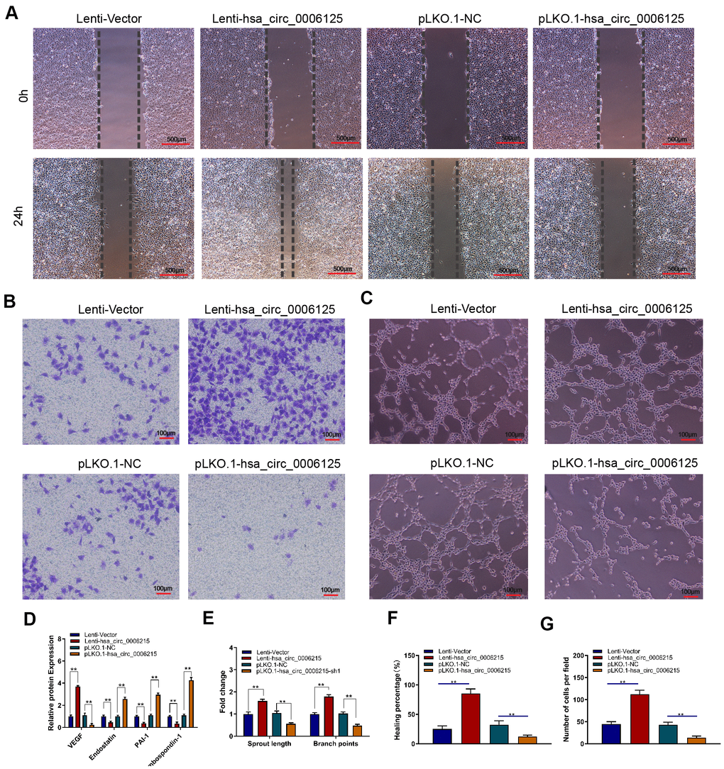 We assessed the effects of hsa_circ_0006215 on the coupling of new bone formation and angiogenesis. We overexpressed and knocked down hsa_circ_0006215 in BMSCs, removed the culture supernatant, and incubated them with HUVECs. The results of scratch (Figure 4A–4F) and Transwell™ (Figure 4B–4G) assays showed that culture supernatant of BMSCs overexpressing hsa_circ_0006215 significantly promoted HUVECs migration. The culture supernatant of BMSCs overexpressing hsa_circ_0006215 significantly promoted angiogenesis (Figure 4C–4E) and increased VEGF expression (Figure 4D) as shown by the results of enzyme-linked immunosorbent assay (ELISA). Western blot analysis showed that hsa_circ_0006215 did not affect angiopoietin-1 and FGF-2 protein expression (Supplementary Figure 1A). The culture supernatant of BMSCs overexpressing hsa_circ_0006215 and transfected with VEGF siRNA did not promote HUVECs migration (Supplementary Figure 1B).