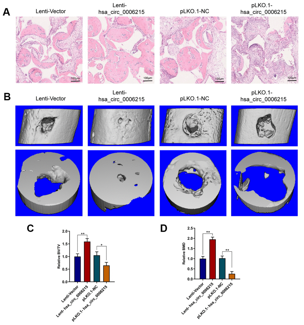 We determined the effects of hsa_circ_0006215 on the osteogenic differentiation of BMSCs using a heterotopic osteogenesis model in vivo. Overexpressed and knocked down hsa_circ_0006215 respectively promoted and inhibited the osteogenic differentiation of BMSCs in vivo (Figure 5A). Overexpressed and knocked down hsa_circ_0006215 respectively promoted and inhibited the repair of the single cortical bone defect in the model in vivo (Figure 5B–5D).