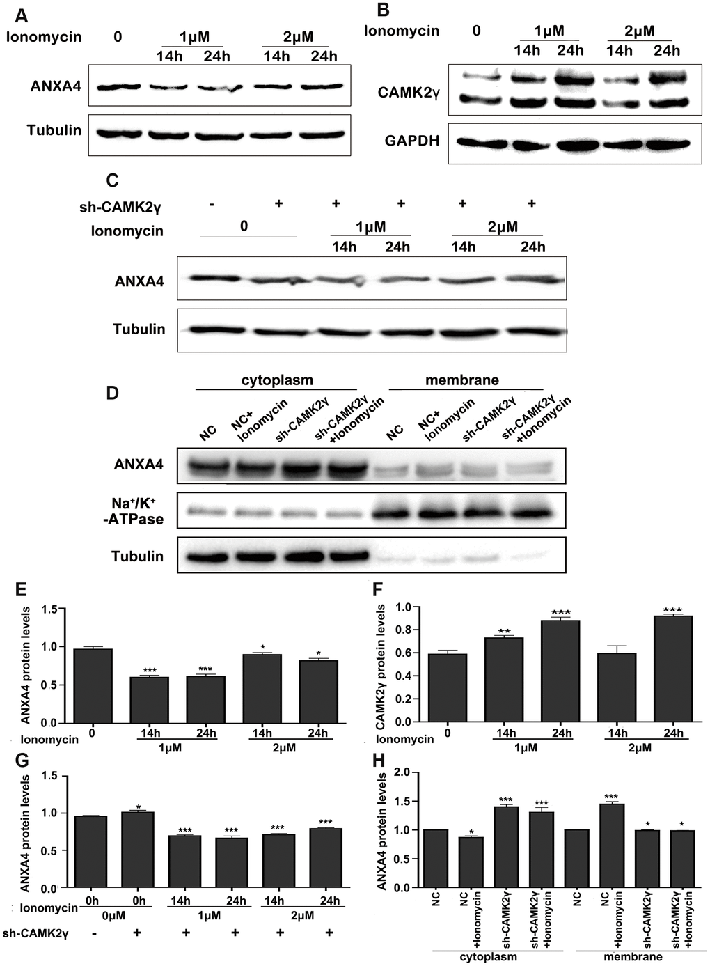 Subsequently, we tested whether Ca2+ affects ANXA4 expression via CAMK. CaMKII is encoded by four different genes, α, β, γ and δ, and CAMK2γ is the major isoform in CRC cells [15]. We therefore evaluated whether Ca2+ decreases ANXA4 expression via CAMK2γ. Our results indicated that an increase in the intracellular Ca2+ level promoted CAMK2γ expression in HT-29 cells. As shown in Figure 2B, 2F, CAMK2γ expression increased nearly 2-fold after 1~2 μM ionomycin treatment for 24 h. We also transfected an shCAMK2γ plasmid into HT-29 cells and then exogenously added ionomycin (0 μM, 1 μM, or 2 μM) and found that interfering with CAMK2γ reversed the negative regulatory effect of increased Ca2+ levels induced by ionomycin on ANXA4 in HT-29 cells (Figure 2C, 2G). Results acquired after membrane-cytoplasm fractionation also clearly showed the translocation of ANXA4 into the membrane fraction after ionomycin treatment (Figure 2D, 2H). The above data suggest that CAMK2γ is important for high ANXA4 expression in HT-29 cells and that the localization of ANXA4 in the cell membrane is Ca2+ dependent.