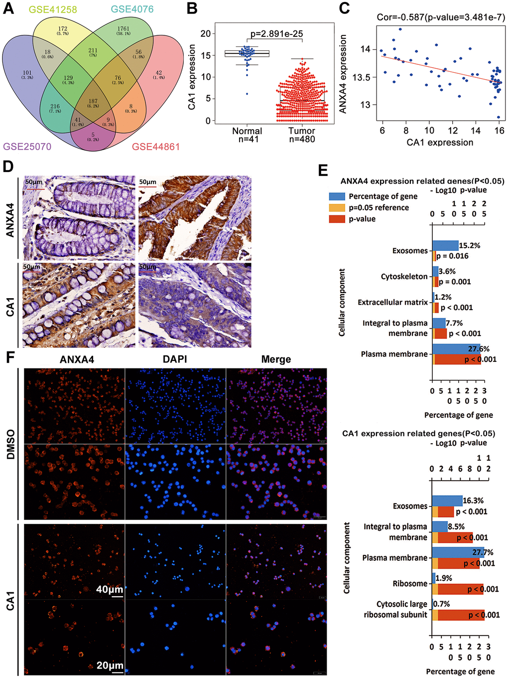 Our previous studies have revealed that CA1 is expressed at low levels and ANXA1 is highly expressed in clinical TNM stages I-IV by MALDI-TOF/TOF MS and immunohistochemical analyses of 103 CRC samples from Chinese patients [16]. In this study, we identified 187 commonly changed genes in CRC samples from the GSE 25070 (USA), GSE 41258 (Israel), GSE 44076 (Spain) and GSE 44861 (USA) datasets (Figure 3A), including CA1, which was also found to have low expression in a TCGA CRC dataset (Figure 3B). There was a negative correlation between CA1 and ANXA4 expression in GSE 20916 and GSE 8671 (Figure 3C), and this negative correlation between CA1 (low) and ANXA4 (high) expression was further verified in 103 Chinese CRC samples by IHC (Figure 3D). By mining TCGA data, we selected 50 upregulated and 50 downregulated genes correlated with ANXA4 or CA1 expression (p<0.05) to perform GO analysis (Figure 3E) and found that these genes are involved in the plasma membrane or integrated in the plasma membrane. This suggested that CA1 might be associated with the membrane-cytoplasm translocation of ANXA4. We used recombinant human CA1 to treat HT-29 cells and found that 1 μl CA1 promoted ANXA4 aggregation in the cell membrane (Figure 3F). These data suggest that the relatively low CA1 expression may be one of the reasons why ANXA4 is highly expressed and located in the cytoplasm in CRC tissues, but the mechanism is not particularly clear and needs further exploration.