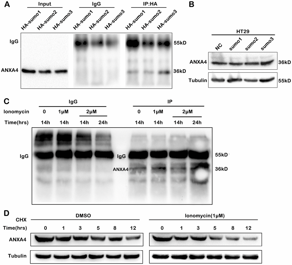 In total, 1 × 107 HEK-293 cells and HT-29 cells were plated in 10-cm dishes and transfected with 10 μg of f1ag-ANXA4 and HA-SUMO1, HA-SUMO2, or HA-SUMO3. After 48 h of co-transfection, the cells were lysed in RIPA buffer. Next, we conducted IP experiments. The first antibody we used was anti-HA.