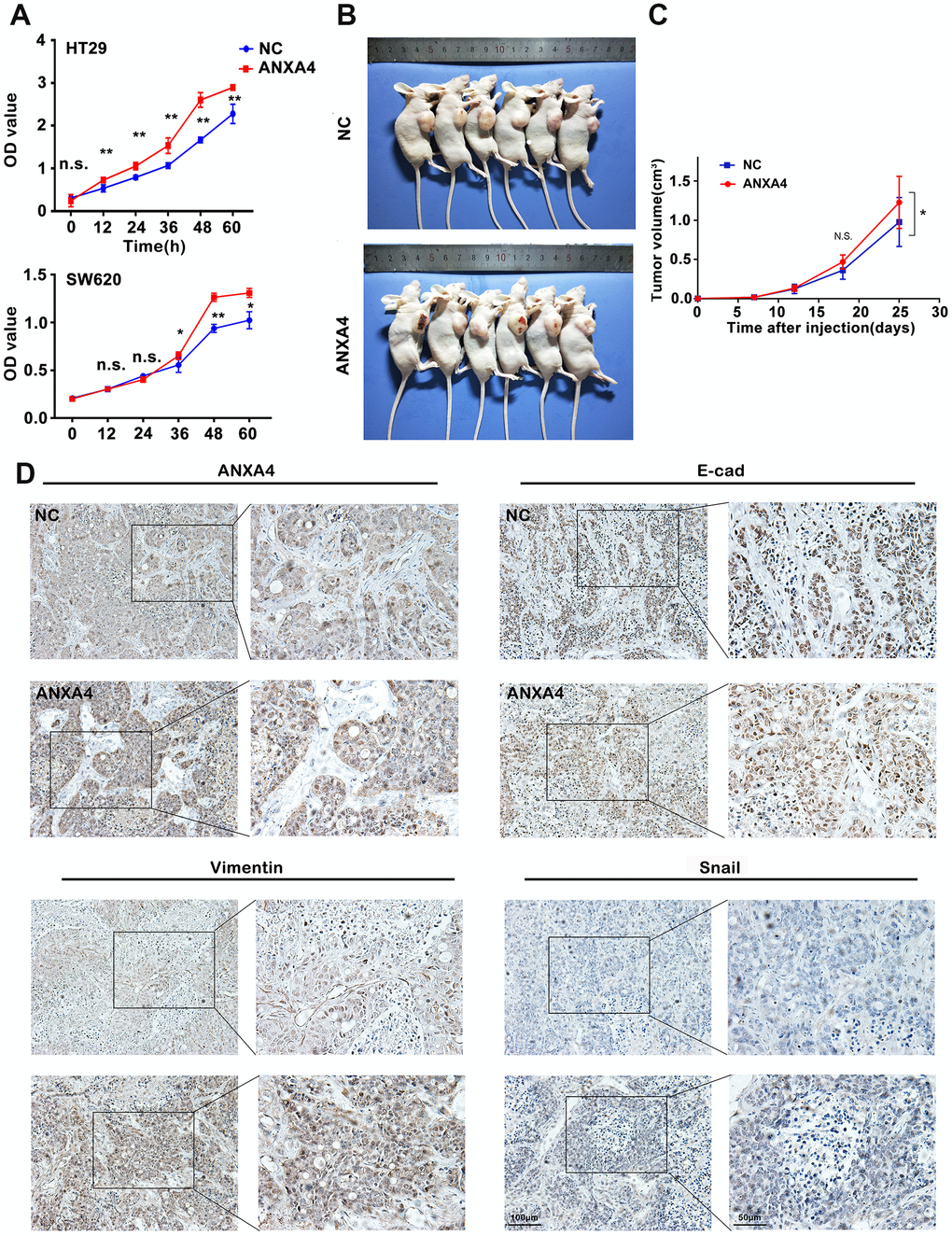 We further explored the impacts of ANXA4 on the proliferation and metastatic potential of HT-29 cells. Overexpression of ANXA4 resulted in an increase in viability, as measured by using a CCK8 assay (Figure 5A). A wound-healing assay and Matrigel invasion assay showed that ANXA4 promoted the cell migration and invasive potential of HT-29 cells (data not shown). In addition, HT-29 cells transfected with ANXA4-overexpression or empty vectors were injected subcutaneously into nude mice, and tumour volume was evaluated at 7, 12, 18, and 25 days. The in vivo xenograft model indicated that the ANXA4 overexpression groups had significantly higher tumourigenicity with obvious haemorrhagic necrosis on the tumour surface than the control group (n=6, n1=3/6 VS n2=0/6) (Figure 5B, 5C). IHC identified the protein expression levels of ANXA4 and the EMT signalling pathway factors E-cadherin, Vimentin and Snail in tumours. Higher ANXA4 expression was accompanied by lower E-cadherin expression and higher Vimentin and Snail expression (Figure 5D).