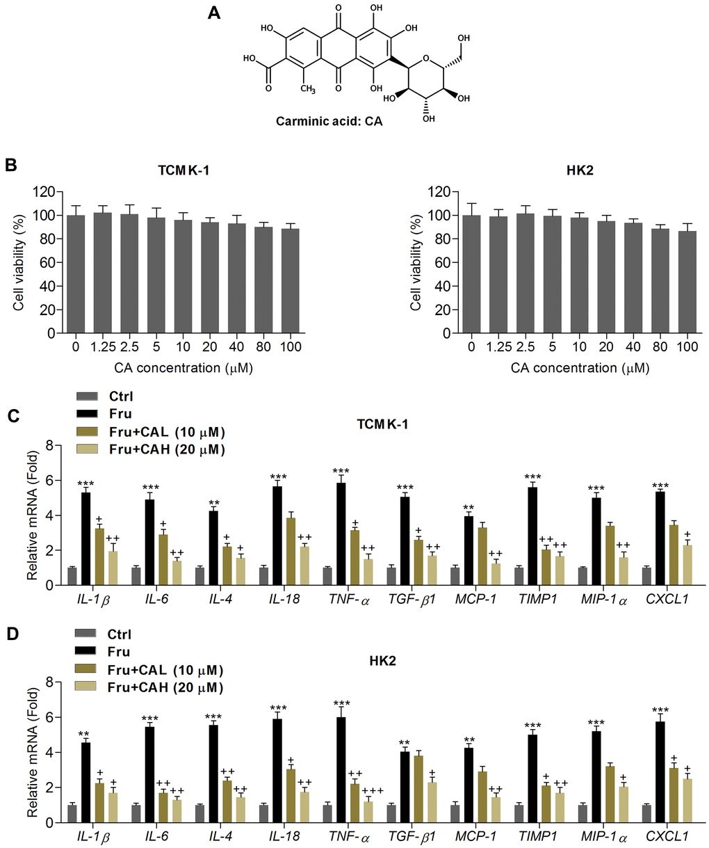 In order to calculate the potential of CA on Fru-induced renal injury, the in vitro analysis was performed at first. As shown in Figure 1B, MTT analysis showed that CA at the concentrations ranging from 1.25 to 100 μM was non-cytotoxic to TCMK-1 and HK2 cells. Then, 10 and 20 μM of CA were used for the following analysis. Inflammation plays a critical role in inducing renal injury caused by chronic Fru intake [27], and thus we calculated the mRNA expression levels of inflammatory factors by RT-qPCR. As expected, Fru-incubated TCMK-1 and HK2 cells exhibited higher expression of inflammatory cytokines or chemokine, including IL-1β, IL-6, IL-4, IL-18, TNF-α, TGF-β1, MCP-1, tissue inhibitor of metalloproteinase 1 (TIMP-1), macrophage inflammatory protein-1α (MIP-1α) and chemokine (C-X-C motif) ligand 1(CXCL1). However, CA treatment markedly reduced the expression of these factors, demonstrating the alleviated inflammatory response (Figure 1C, 1D). To further explore the potential anti-inflammatory effects of CA, LPS, an inducer for inflammation, was then subjected to TCMK-1 and HK2 cells. As shown in Supplementary Figure 1A, 1B, the mRNA expression levels of IL-1β, IL-6, IL-18 and TNF-α were significantly up-regulated following LPS stimulation. As expected, these results induced by LPS were effectively reversed by CA co-incubation. The findings above confirmed that CA displayed anti-inflammatory abilities.