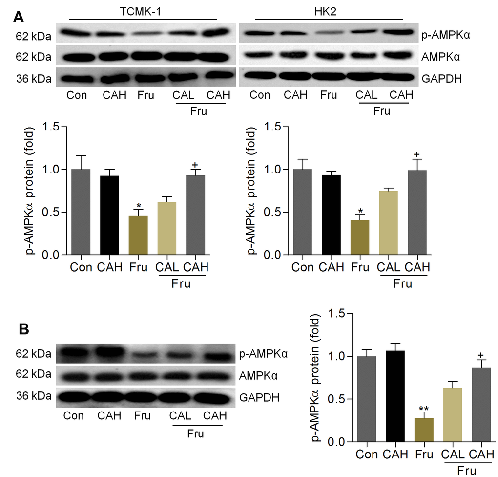 As Fur-triggered renal injury is a metabolic disorder, and AMP-activated protein kinase α (AMPKα) activation is involved in the event [36]. To explore if the protective effects of CA against Fru-induced kidney injury was associated with AMPKα activation, western blotting analysis was then performed. As shown in Figure 10A, we found that AMPKα activation was markedly blocked in Fru-treated cells, while being mitigated by CA incubation, as evidenced by the up-regulated expression of p-AMPKα. Consistently, mice with Fru challenge exhibited significantly reduced expression of p-AMPKα in renal tissues, and this result was effectively rescued by CA supplementation (Figure 10B). Therefore, results above showed that CA-alleviated renal injury and metabolic disorder were associated with the improvement of AMPKα activation.