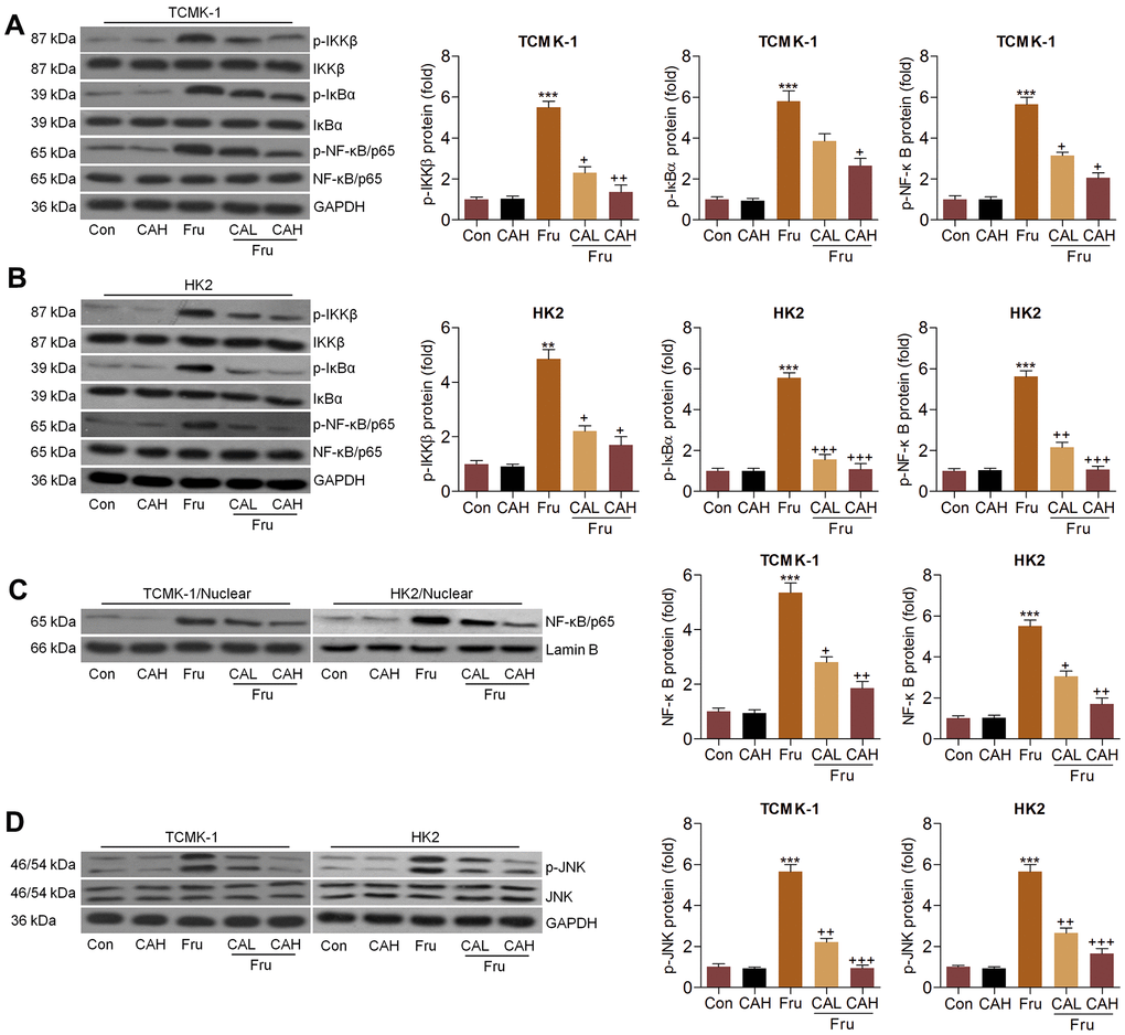 The activation of NF-κB and c-Jun N-terminal kinase (JNK) signaling pathways are critical in inducing inflammation [15, 28], and were then explored. Western blot analysis indicated that Fru significantly activated NF-κB signaling compared to the Ctrl group, as proved by the considerable up-regulation of phosphorylated IκB kinase complex β (p-IKKβ), phosphorylated inhibitors of κB-α (p-IκBα) and p-NF-κB in TCMK-1 and HK2 cells. But CA co-treatment significantly reduced the phosphorylation of IKKβ, IκBα and NF-κB (Figure 2A, 2B). Consistently, NF-κB nuclear translocation stimulated by Fru was also hindered in cells co-treated with CA (Figure 2C), confirming the role of CA in suppressing NF-κB signaling. Moreover, we found that Fru-induced JNK phosphorylation was greatly reduced by CA in renal cells (Figure 2D). Collectively, the data here demonstrated that CA had anti-inflammatory effects in Fru-treated cells through blocking NF-κB and JNK activation.