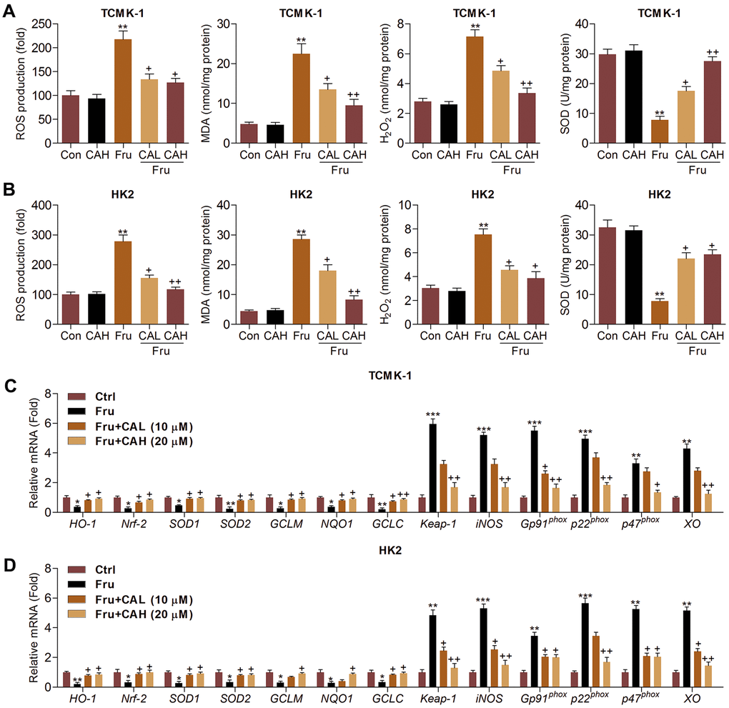 Oxidative stress contributes to the progression of Fru-triggered renal injury [29], and CA has anti-oxidant biological activity [25, 26]. In this regard, we attempted to investigate if CA could reduce ROS production to ameliorate the development of kidney damage. As illustrated in Figure 3A, 3B, we found that intracellular ROS production, malondialdehyde (MDA) levels and H2O2 contents were markedly enhanced by Fru, whereas being down-regulated by CA treatment. On the contrary, SOD activity repressed by Fru was greatly rescued due to CA addition. Then, RT-qPCR analysis further showed that Fru significantly reduced the expression of anti-oxidants, including HO-1, Nrf-2, SOD1, SOD2, glutamate-cysteine ligase modifier subunit (GCLM), glutamate-cysteine ligase catalytic subunit (GCLC) and NQO1, while enhanced the expression of Kelch-like ECH-associated protein 1 (Keap-1), inducible nitric oxide synthase (iNOS), Gp91phox, p22phox, p47phox and xanthine oxidase (XO). However, these effects were effectively reversed by the treatment of CA (Figure 3C, 3D). Together, these findings demonstrated that CA had anti-oxidative effects, which might be involved in the alleviation of renal injury induced by Fru.