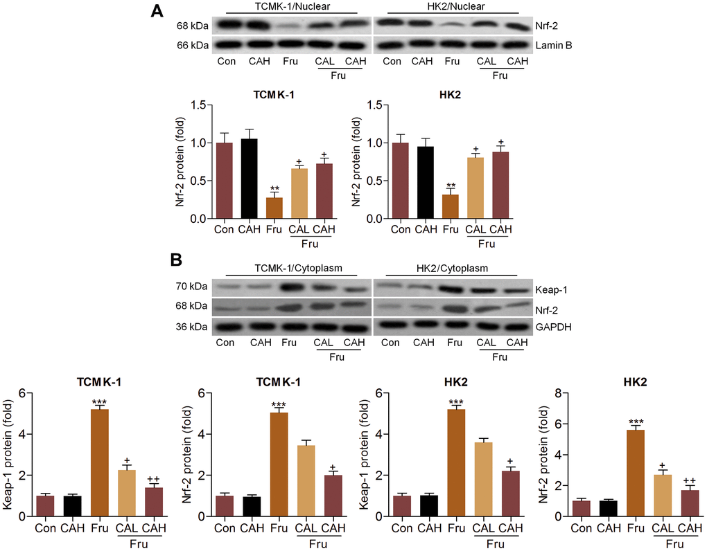 Considering the pivotal role of Nrf-2 in regulating ROS production, we then explored the change of Nrf-2 activation. As shown in Figure 4A, nuclear Nrf-2 was clearly reduced in Fru-treated TCMK-1 and HK2 cells, which were restored by the co-culture of CA. In contrast, the expression levels of Keap-1 and Nrf-2 in cytoplasm were significantly increased following Fru stimulation. But these findings were abolished by CA (Figure 4B). Data in this part suggested that CA could activate Nrf-2 signaling to restrain oxidative stress.