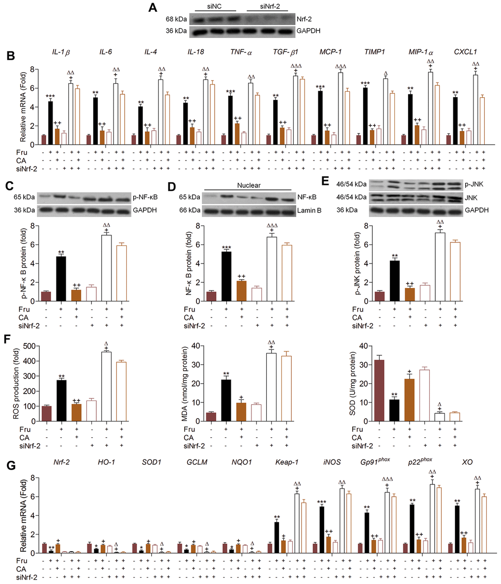 In addition to oxidative stress, Nrf-2 was also reported to modulate inflammation [30]. Therefore, we attempted to explore if CA-regulated renal injury was dependent on Nrf-2 activation. Therefore, Nrf-2 was knocked down by transfection with siNrf-2 (Figure 5A). Then, the effects of CA on inflammation and oxidative stress were investigated in Fru and/or CA-treated TCMK-1 cells with or without Nrf-2 knockdown. As shown in Figure 5B, surprisingly, we found that Fru-induced expression of pro-inflammatory factors was further promoted by siNrf-2. CA-reduced mRNA expression of inflammatory cytokines and chemokine was almost abrogated in Fru-incubated cells with Nrf-2 knockdown. Similarly, Nrf-2 knockdown markedly promoted p-NF-κB expression in Fru-treated cells, accompanied by the evident increase of NF-κB nuclear transition. On the other, siNrf-2 significantly abolished CA-inhibited activation of NF-κB signaling in Fru-treated cells (Figure 5C, 5D). Similarly, Fru-stimulated p-JNK was further accelerated by Nrf-2 knockdown. In Fru-cultured cells, CA-suppressed JNK activation was markedly diminished when Nrf-2 was knocked down (Figure 5E). As expected, Nrf-2 silence markedly enhanced ROS generation in Fru-exposed cells, along with the greatly increased MDA levels. Of note, CA-reduced ROS and MDA in Fru-incubated cells were clearly eliminated by Nrf-2 silence. Opposite results were detected in the change of SOD as shown in Figure 5F. Then, RT-qPCR analysis confirmed that the anti-oxidants including HO-1, SOD1, GCLM and NQO-1 suppressed by Fru were further down-regulated when Nrf-2 was inhibited, while Keap-1, iNOS, p22phox and XO were further accelerated. In accordance with expectation, CA-alleviated oxidative stress was clearly abolished by siNrf-2 in Fru-exposed cells (Figure 5G). Taken together, all findings in this part suggested that CA-attenuated inflammation and oxidative stress induced by Fru were mainly dependent on Nrf-2 signaling.