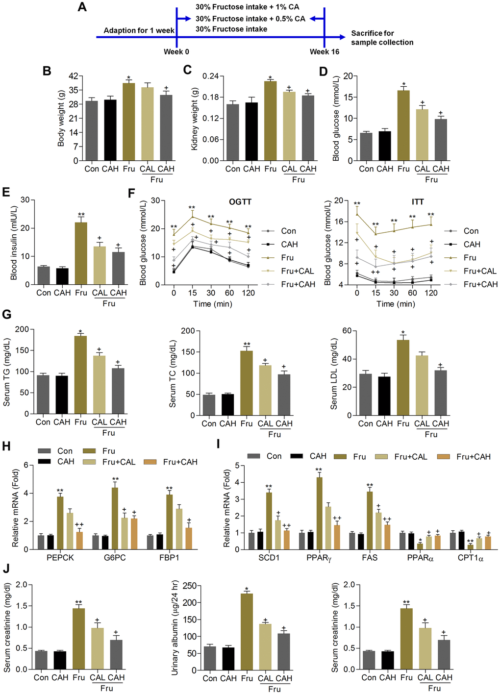 Male C57BL/6 mice (6-7 weeks of age, weighing 18-20 g) were purchased from the Beijing Vital River Laboratory Animal Technology Co., Ltd (Beijing, China). All animal treatment procedures were approved by the Institutional Animal Care and Use Committee in Chongqing Key Laboratory of Medicinal Resources in the Three Gorges Reservoir Region, School of Biological and Chemical Engineering, Chongqing University of Education, and were performed in accordance with the Guide for the Care and Use of Laboratory Animals, issued by the National Institutes of Health in 1996. The protocols performed in the study were in accordance with the Regulations of Experimental Animal Administration issued by the Ministry of Science and Technology of the People’s Republic of China (http://www.most.gov.cn). All mice were housed in a constant temperature (25 ± 1° C), humidity (50 ± 5%) and specific pathogen-free (SPF) controlled environment under a 12-h light: 12-h dark cycle with free access to food and water. After adaption for 7 days, mice were randomly divided into 5 groups as follows: the control group (Con), the control group plus higher concentration of CA (1% CA; CAH), Fru group, Fru plus lower concentration of CA group (0.5% CA; Fru+CAL), and Fru plus higher concentration of CA group (1% CA; Fru+CAH). Fru group of mice was fed with water containing 30% (w/v) of Fru. The concentration of Fru solution used in this study was decided based on previous reports [63, 64]. Fru-challenged mice were simultaneously supplemented with 0.5% or 1% CA (HPLC ≥ 95%, Sensient Technologies) dissolved in 30% Fru solution. The precise dosage of CA (0.75 g/kg/daily and 1.5 g/kg/daily, respectively) was evaluated for each mouse per day according to the body weight. The body weight of mice was measured every week. After 16 weeks, the mice were sacrificed, and the blood (0.6-1.0 ml) was harvested from the eyeball of each animal. The kidney samples of mice were isolated and measured, and then were stored at -80° C for further assays. In addition, major organs including liver, spleen, lung and heart were collected for toxicity analysis. Prior to sacrifice, each mouse was placed in a metabolic cage to collect 24 h urine, which was centrifuged at 4° C (3000 × g for 10 min) to remove particulate contaminants and stored at -80° C for albumin assessment.