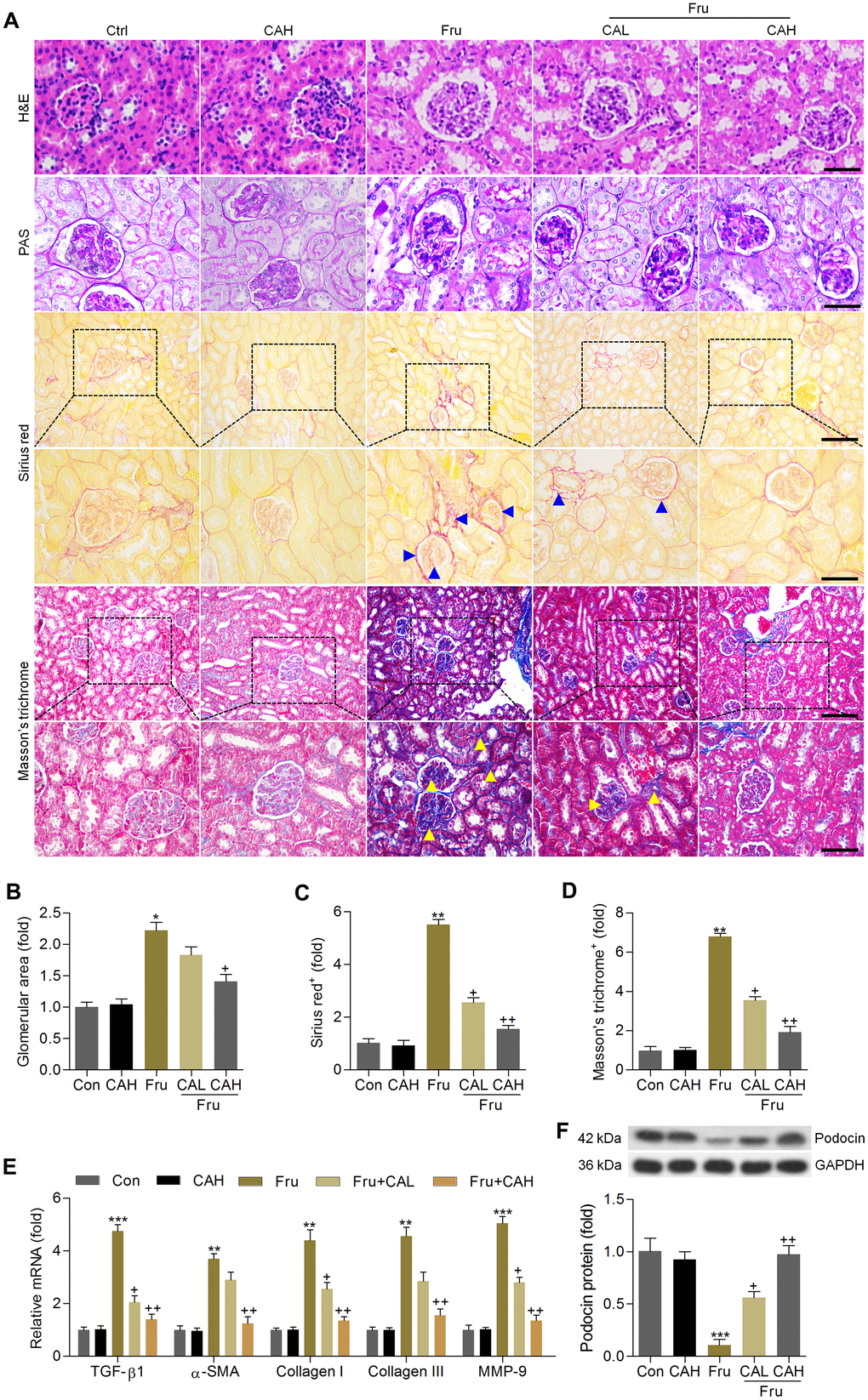H&E and PAS staining demonstrated that compared with the Con group, Fru-fed mice had notable glomerular hypertrophy, whereas these hypertrophic changes were markedly reduced in CA-treated groups (Figure 7A, 7B). Sirius red and Masson’s trichrome staining showed that Fru led to collagen accumulation mainly in glomeruli and tubulointerstitium (as arrows indicated), and CA improved these histologic changes of the kidneys (Figure 7A, 7C, 7D). Similar anti-fibrotic effects of CA were observed by the RT-qPCR analysis, as evidenced by the significantly reduced mRNA levels of TGF-β1, α-smooth muscle actin (α-SMA), collagen I, collagen III and matrix-metalloproteinase-9 (MMP-9) in renal tissues (Figure 7E). To further confirm the potential anti-fibrotic abilities of CA, the in vitro studies were conducted in cells incubated with or without TGF-β. As shown in Supplementary Figure 1C, 1D. RT-qPCR analysis indicated that cells with TGF-β stimulation exhibited higher expression of α-SMA, collagen I, collagen III and MMP-9 than that of the Con group, which were, however, decreased by CA co-incubation, further demonstrating the anti-fibrotic effects of CA that were independent of glycemic control. The decrease of podocin is a starting point for progressive kidney disease [34]. Western blot analysis demonstrated that podocin expression levels were markedly reduced in kidneys of Fru-challenged mice, while being improved in mice supplemented with CA (Figure 7F). Altogether, these findings indicated that CA had protective effects against Fru-induced renal injury.