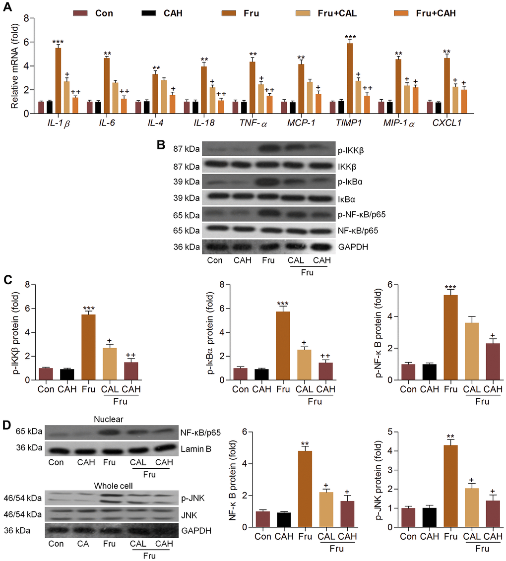 In this section, RT-qPCR analysis suggested that Fru-challenged mice had higher expression levels of inflammatory factors, such as IL-1β, IL-6, IL-4, IL-18, TNF-α, MCP-1, TIMP1, MIP-1α and CXCL1. As detected in vitro, CA treatment markedly reduced the mRNA levels of these molecules (Figure 8A). Moreover, Fru-activated IKKβ, IκBα and NF-κB were significantly abolished by CA (Figure 8B, 8C). Also, NF-κB nuclear translocation and JNK activation enhanced by Fru were evidently abrogated by CA supplementation (Figure 8D). These in vivo results confirmed the anti-inflammatory effects of CA against Fru-induced renal injury.