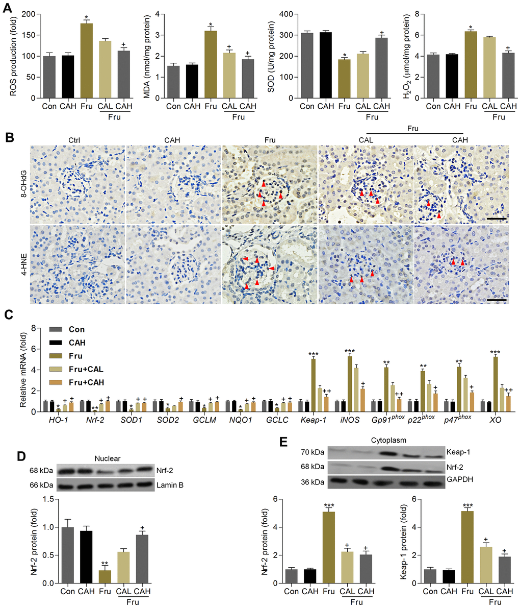 The anti-oxidative role of CA was further explored in kidneys of Fru-challenged mice. As shown in Figure 9A, ROS production, MDA levels and H2O2 contents in renal tissues were markedly up-regulated in Fru-fed mice, whereas SOD activity was down-regulated. However, these findings were clearly reversed by CA. 8-OHdG and 4-HNE are well-known markers for oxidative stress [35], and thus were investigated. Immunohistochemistry analysis demonstrated that Fru challenge increased the expression of 8-OHdG and 4-HNE in renal sections mainly in the glomerulus areas, which were evidently attenuated by CA treatments (Figure 9B). Consistently, Fru-decreased mRNA levels of HO-1, Nrf-2, SOD1, SOD2, GCLM, NQO-1 and GCLC were greatly rescued by CA, and opposite results were observed in the expression changes of Keap-1, iNOS, Gp91phox, p22phox, p47phox and XO (Figure 9C). Western blot analysis demonstrated that Nrf-2 nuclear expression levels were highly restored in kidneys of Fru-treated mice (Figure 9D). On the contrary, Keap-1 and Nrf-2 expression levels in cytoplasm of renal samples were highly increased by Fru, while being decreased in mice co-treated with CA (Figure 9E). Therefore, findings above showed that CA-attenuated renal injury caused by Fru might be associated with its anti-oxidative ability.