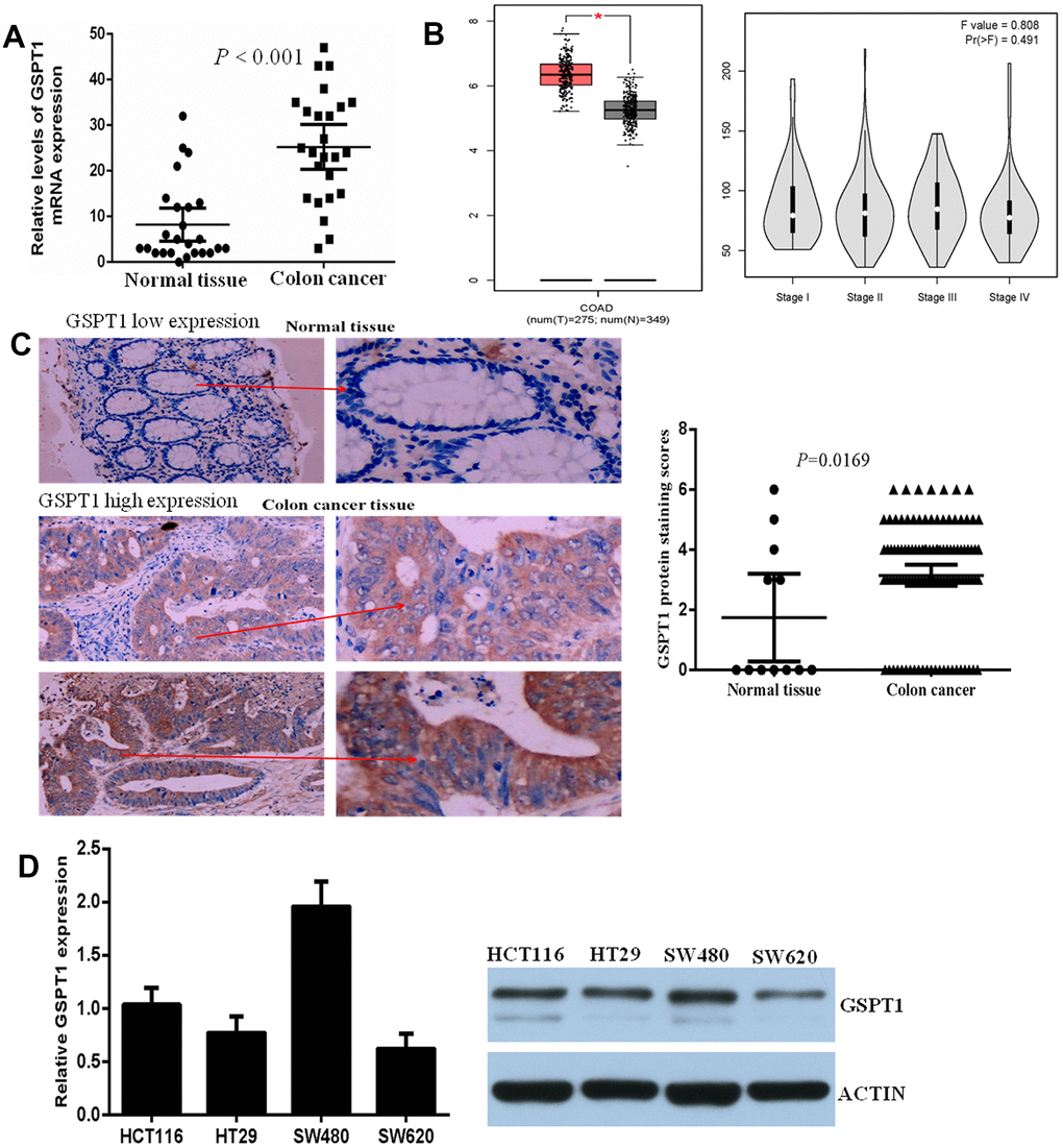 In a previous study from our group, we analyzed colon cancer sequencing data in the cancer genome Altas (TCGA), mined the differentially expressed genes in normal colon tissues versus colon cancer tissues, and then analyzed the biological processes associated with the differentially expressed genes. One identified gene was GSPT1 (G1 to S phase transition 1), which plays an important role in the biological process of colorectal cancer. As shown by the UCSC genomic browser, GSPT1 is located in the long arm 13 region of human chromosome 16 (chr16 p13.13) and consists of 10 exons in the protein coding region. During transcription, GSPT1 forms two different transcripts through variable splicing, which translate and encode 508 amino acids. GSPT1 plays an important role in the genesis, progression, and prognosis of colon cancer. However, the biological function and molecular mechanism of GSPT1 in colon cancer remain unclear. In the present study, cell biology, pathology, and molecular biology technology are used to clarify the biological function of GSPT1 in colon cancer. Specifically, high-throughput Immunoprecipitation mass spectrometry (IP-MS) analysis is used to identify the target gene regulated by GSPT1 and the molecular signal pathway involved.