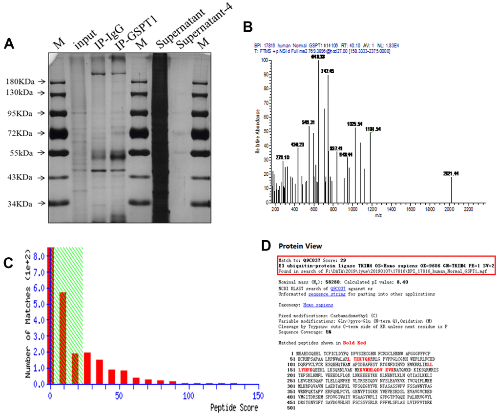 To identify the binding protein of GSPT1, we carried out immunoprecipitation (IP) of GSPT1. The silver staining results showed that the IP-GSPT1 group had more specific bands than the IP normal IgG group, and so the two bands were detected by mass spectrometry (Figure 5A, 5B). The binding relationship between GSPT1 and E3 ubiquitin protein ligase (TRIM4) was determined by mass spectrometry (Figure 5C, 5D).