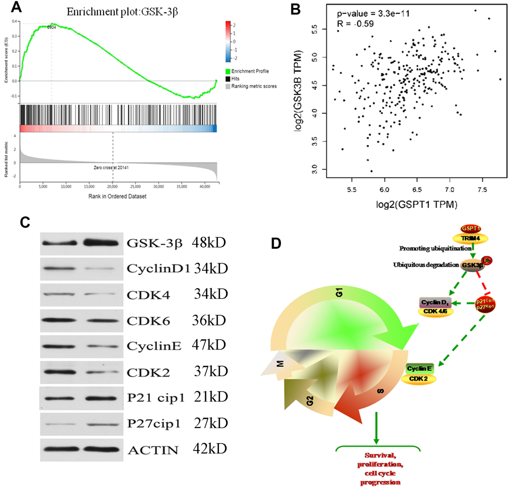 The results of Gene Set Enrichment Analysis (GSEA) suggested that the GSK-3β signaling pathway is the downstream signaling pathway of GSPT1 (Figure 6A). The expression of GSPT1 and GSK3β were negatively correlated in the TCGA database (Figure 6B). In order to investigate the relationship between GSPT1 and GSK-3β in colon cancer cells, the expression of GSK-3β was up-regulated after GSPT1 was silenced in HCT116 cells (Figure 6C). According to the relevant literature on the cell cycle pathway, GSK-3β is an important protein in the transition from G1 phase to S phase and its regulation of the cell cycle is realized by CyclinD1, CDK4/6, cyclinE, CDK2, etc. [14, 15]. After GSPT1 was silenced in HCT116 colon cancer cells, the expression of CyclinD1, CDK4/6, cyclinE, CDK2, p21, and p27 was detected by Western blot. The results showed that GSK-3β, p21, and p27 were up-regulated, whereas the expression of CyclinD1, CDK4/6, cyclinE, and CDK2 decreased (Figure 6C). Taken together, these results suggest that GSPT1 regulates CyclinD1, CDK4, and Cdk6 through GSK-3 β, and indirectly affects the expression of cyclinE and CDK2 through p21 and p27, thus regulating the transformation of colon cancer cells from the G1 phase to S phase and promoting tumor progression (Figure 6D).