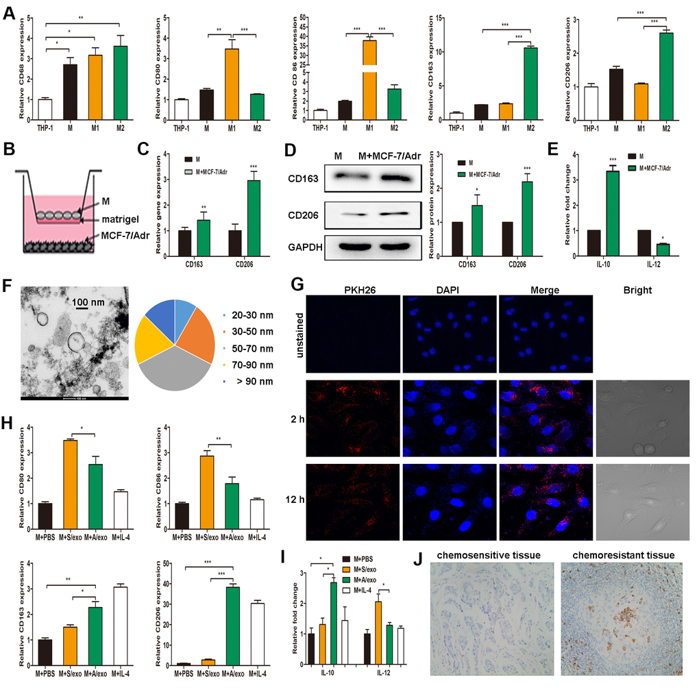 THP-1 monocytes were differentiated into macrophages by a 24 h incubation with PMA. After treatment with lipopolysaccharide, macrophages expressing CD68 were converted to M1 macrophages expressing CD80 and CD86 (M1 phenotype markers). Alternatively, they were polarized into M2 macrophages following treatment with IL-4, expressing CD163 and CD206 (M2 phenotype markers) (Figure 1A). Given that macrophages are the most abundant immune-related stromal cells within the chemoresistant BCa tissues [5, 6], we therefore mimicked such tumor microenvironment by seeding MCF-7/Adr cells (lower) with macrophages (upper) in a co-culture Boyden chamber, which prevented direct cell-cell contact (Figure 1B). The levels of M2 phenotype markers were detected in macrophages, and increased expressions of CD163 and CD206 were found in macrophages co-cultured with MCF-7/Adr, with respect to control macrophages (Figure 1C, 1D). Consistent with the changes in phenotype markers, macrophages co-cultured with MCF-7/Adr exhibited a higher level of IL-10 and a lower level of IL-12 (Figure 1E). These data indicated that MCF-7/Adr cells were able to promote macrophages M2 polarization.