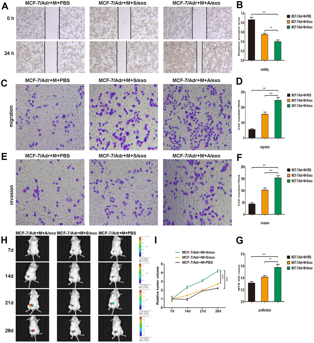 Cell migration and invasion was performed using the transwell assay. For migration assay, MCF-7/Adr cells were seeded on the top chamber. The conditioned medium from differently exosome-treated macrophages were added to the bottom chamber. For invasion assay, the undersides of 8-μm inserts were coated with matrigel (BD Biosciences, U.S.A.) at 37° C overnight before seeding cells. After 24 h incubation, cells that had migrated or invaded to the undersides of the inserts were fixed with 4% paraformaldehyde for 30 min, stained with 1% crystal violet solution, and counted under a microscope in three randomly chosen fields.