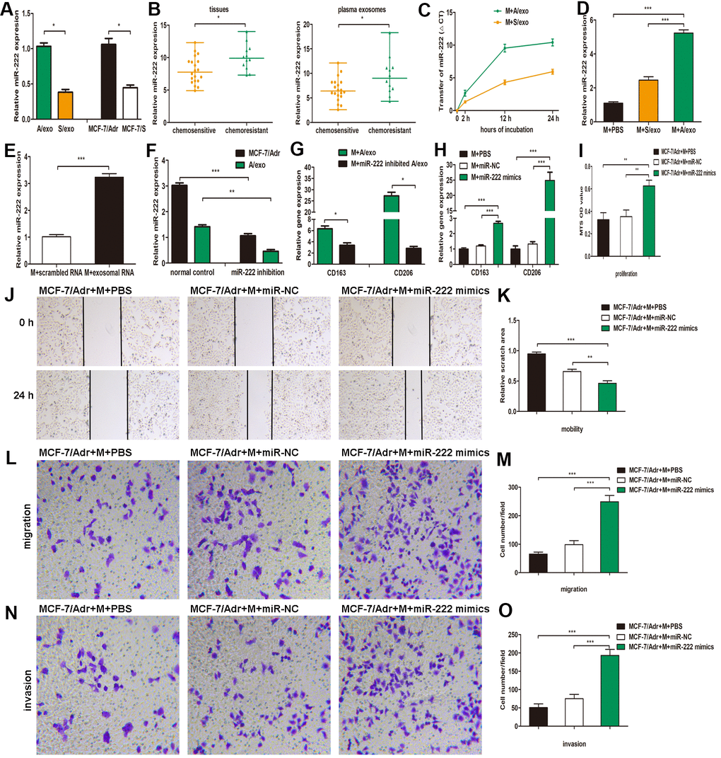 To study the function of exosomal miR-222 in macrophages M2 polarization, we inhibited miR-222 expression in MCF-7/Adr and overexpressed miR-222 in macrophages. The inhibition by miR-222 inhibitors resulted in a reduction of miR-222 in MCF-7/Adr cells and the corresponding A/exo, while the overexpression by miR-222 mimics led to an increase of miR-222 in macrophages, as determined by PCR (Figure 3F). It was also found that M2 phenotype markers CD163 and CD206 were decreased in macrophages cultured with A/exo derived from miR-222-inhibited MCF-7/Adr cells (Figure 3G). Additionally, macrophages transfected with miR-222 mimics displayed increased expressions of CD163 and CD206 (Figure 3H). We then prepared the conditioned medium from macrophages transfected with miR-222 mimics and co-cultured with MCF-7/Adr cells. Consistent with the aforementioned observations, the proliferation, mobility, migration and invasion abilities of MCF-7/Adr cells were significantly enhanced after treatment of conditioned medium from macrophages transfected with miR-222 mimics (Figure 3I–3O). Therefore, exosomal miR-222 could induce macrophages M2 polarization to promote the proliferation, migration and invasion of BCa cells.