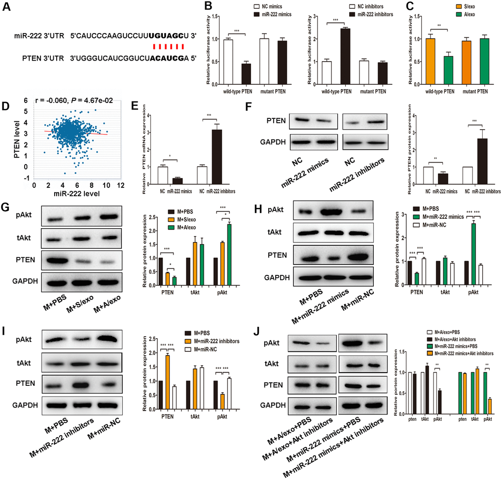 To explore the detailed mechanisms of exosomal miR-222 in macrophages M2 polarization, we predicted its potential target gene PTEN by the online tool PicTar (Figure 4A). Using 3’UTR luciferase reporter assays, we found that miR-222 overexpression significantly inhibited luciferase activity in cells expressing wild-type PTEN 3’UTR reporters, whereas miR-222 inhibitors abolished this suppression (Figure 4B). Moreover, miR-222-containing A/exo effectively reduced luciferase activity in cells expressing wild-type PTEN 3’UTR reporters with respect to mutant PTEN 3’UTR reporters (Figure 4C). PTEN expression is negatively correlated with miR-222 level according to TCGA analysis (Figure 4D). Coincidently, overexpression of miR-222 by mimics significantly decreased PTEN expression in macrophages, while miR-222 inhibition revealed an opposite effect (Figure 4E, 4F).