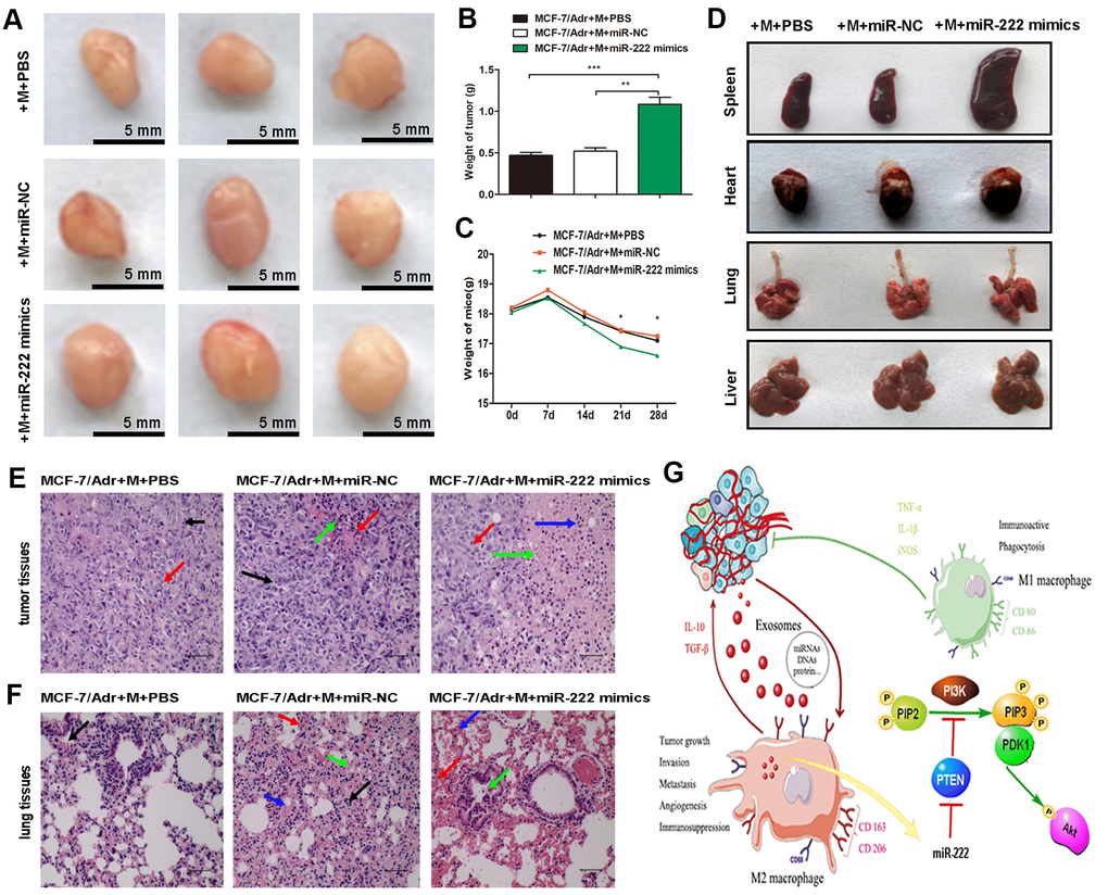 Next, we determined whether exosomal miR-222 stimulated tumor formation in vivo. MCF-7/Adr mixed with macrophages transfected with miR-222 mimics were prepared and implanted subcutaneously into mice, and the transplanted tumors and tissue samples were collected 4 weeks later. Versus those treated with MCF-7/Adr mixed with macrophages transfected with controls, the volume and weight of subcutaneous tumors in MCF-7/Adr mixed with macrophages transfected with miR-222 mimics group were increased (Figure 5A, 5B), whereas the weight of mice in MCF-7/Adr cells mixed with macrophages transfected with miR-222 mimics group was significantly reduced (Figure 5C). Although we failed to obtain any nodules of metastatic tumors in lung and liver, we observed that the spleen, heart, and lung were larger in MCF-7/Adr cells mixed with macrophages transfected with miR-222 mimics group with respect to control groups (Figure 5D). Histomorphology of the obtained tumors and lung tissues were further observed by using HE staining. We found that the malignant cell proliferation (red arrow), necrosis area (green arrow), and macrophages infiltration (blue arrow) were increased in mice treated with MCF-7/Adr mixed with macrophages transfected with miR-222 mimics group in respect to control groups, suggesting the accelerated tumor cell growth (Figure 5E). Moreover, there was an increase of defuse hemorrhage (red arrow), stromal cells necrosis (blue arrow), and bronchus exudation (green arrow) in mice treated with MCF-7/Adr mixed with macrophages transfected with miR-222 mimics group, suggesting a gradual generation of lung pre-metastatic niche (Figure 5F). These results suggested that exosomal miR-222 stimulated tumor growth via macrophages M2 polarization and pre-metastatic niche formation in vivo.