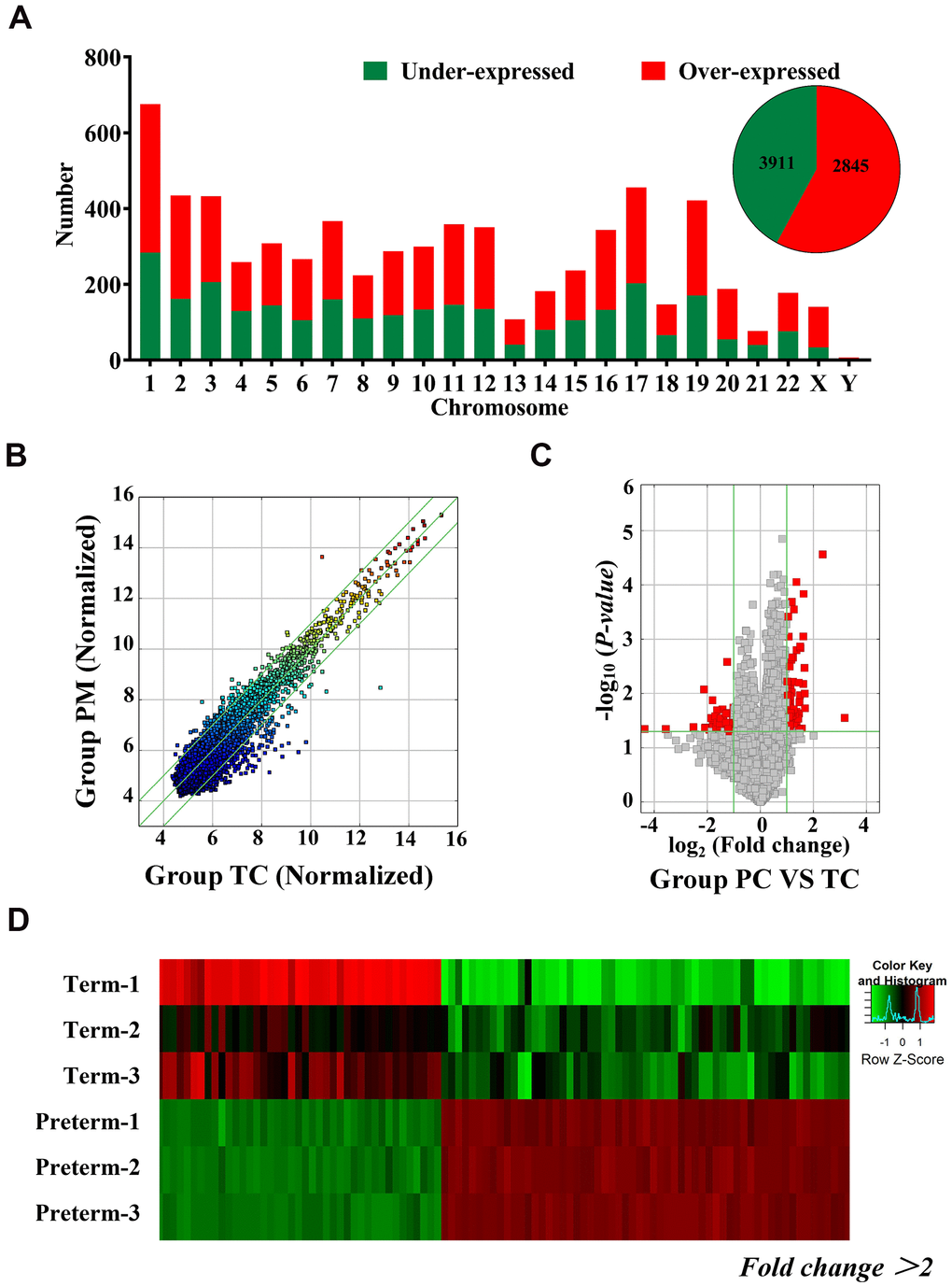 Exosomal circRNAs from TC and the PC were identified through microarray analysis. A total of 6756 circRNAs were detected and 2845 were downregulated and 3911 circRNAs were upregulated in PC. These differentially expressed circRNAs were distributed across all chromosomes, including sex chromosomes (Figure 2A). Detailed information on the differentially expressed circRNAs is shown in Supplementary Table 1. Detected circRNAs are also shown by scatter plots and volcano maps (Figure 2B, 2C), and a heat map illustrates the differences in circRNAs, 66 of which were upregulated and 42 were downregulated (fold change (FD) > 2, P < 0.05) (Figure 2D).