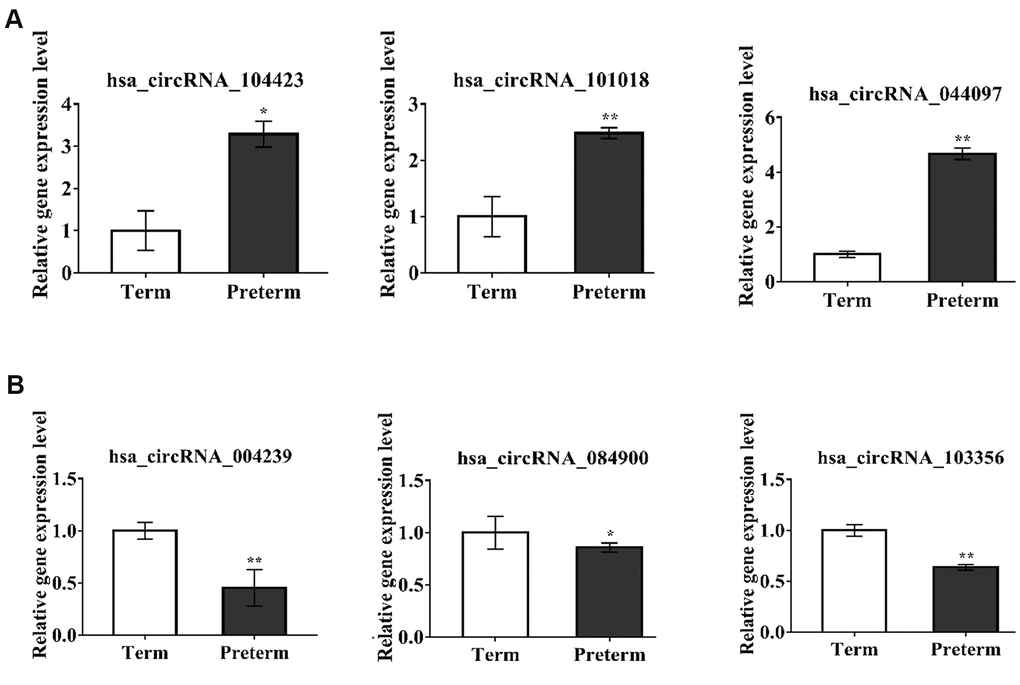 To verify the exosomal circRNAs which were significantly expressed in the PC and TC, we randomly selected 6 differentially expressed circRNAs for qRT-PCR verification in the same samples used for the HC microarray analysis; 3 upregulated (hsa_circRNA_104423, hsa_circRNA_101018, hsa_circRNA_044097) and 3 downregulated (hsa_circRNA_004239, hsa_circRNA_084900, hsa_circRNA_103356) circRNAs were selected (Figure 3A, 3B). The results showed that verified circRNAs expression was consistent with the microarray analysis results.