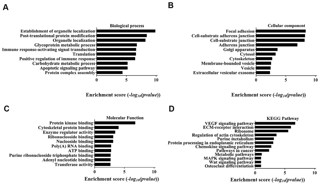 GO enrichment and signal pathway analysis were performed to assess potential functions. Biological process analysis showed that the circRNAs were mostly involved in organelle localization, post-translational protein modification, glycoprotein metabolic process, immune response-activating signal transduction translation, positive regulation of immune response, carbohydrate metabolic process, apoptotic signalling pathway, and protein complex assembly (Figure 4A). The cellular component analysis demonstrated that the potential functions were significantly related to focal adhesion, cell-substrate junction, Golgi apparatus, cytosol, cytoskeleton, membrane-bound vesicle, vesicle and extracellular vesicular exosomes (Figure 4B). Molecular function indicated that the most significant functions were protein kinase binding, cytoskeletal protein binding, enzyme regulator activity, ribonucleoside binding, nucleoside binding, poly(A) RNA binding, ATP binding purine ribonucleoside triphosphate binding, adenyl nucleotide binding and transferase activity (Figure 4C). Analysis of the KEGG pathway showed that the VEGF signalling pathway was the most significant pathway.