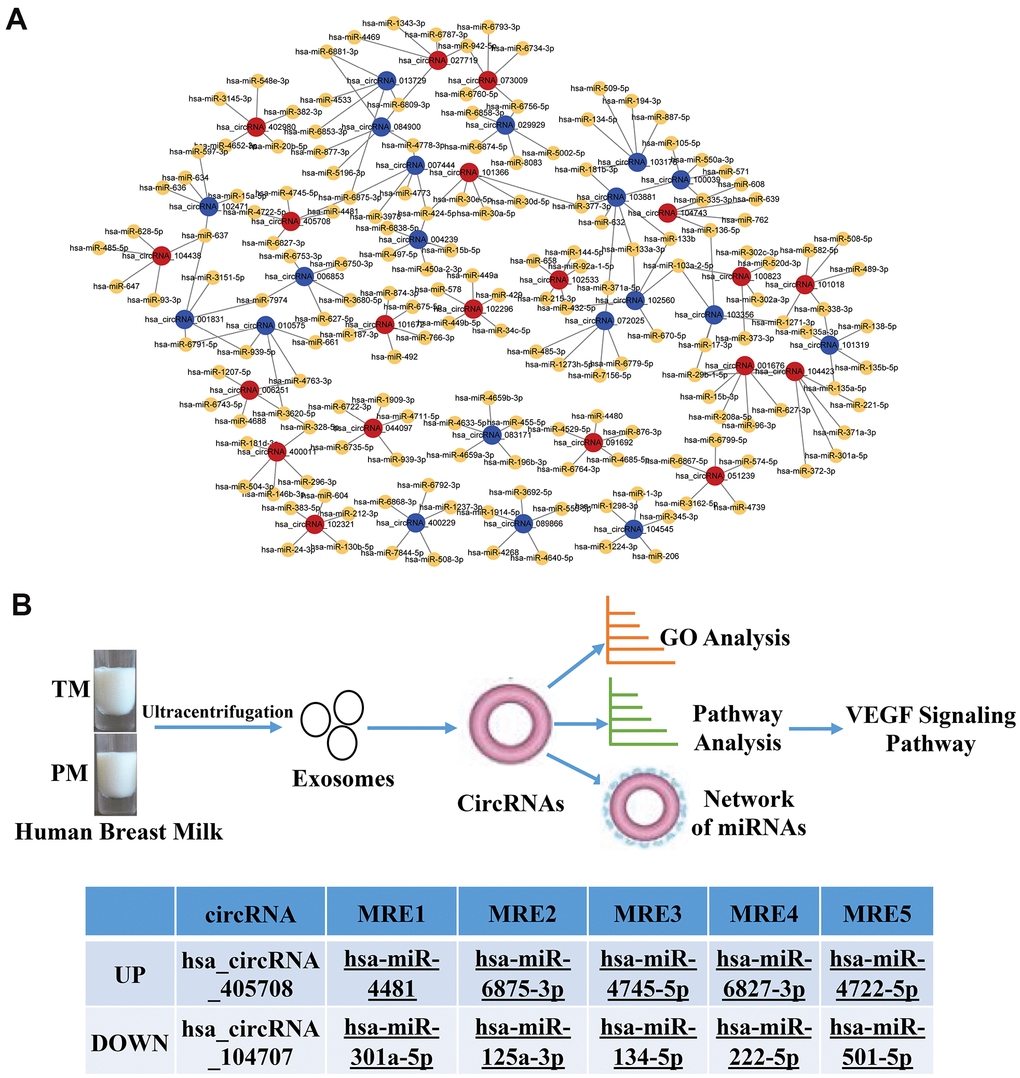 Recent studies have also shown that circRNAs can bind miRNA and regulate downstream miRNAs, all of which are involved in various pathological mechanisms. For example, studies conducted by Eur Heart J et al. showed that the cardiac circRNA HRCR could bind directly binds to miR-223 and inhibits HRCR expression in human cardiomyocytes, producing a hypertrophic response [37], and ciRS-7 (human circRNA cerebellar degeneration-related protein 1 transcript (CDR1)) binding to related miRNAs can affect the availability of miR-7 to bind to its target mRNAs [38–40]. CircSRY also acts as a sponge of miR-138 and as a platform for the binding of miR-138, regulating the mRNA translation of its targets [41]. Sponging of 9 miRNAs, including miR-124, which regulates cell growth, has been previously reported [42]. In our study, we predicted that exosomal circRNAs derived from the PC and the TC bind various miRNAs, some of which have been shown to regulate the physiology and pathology of intestinal development. For example, hsa_circ_0000726 binds miRNA181 and reduces HK and TNF-α expression, inducing glycometabolism and the inflammatory response, respectively [43]. Hsa_circ_083171 binds to miRNA-455, and miR-455-5p downregulates STRA6, reducing cell proliferation [44] and alleviating apoptosis, oxidative stress and the inflammatory response [45]. MiR-455-5p can also alleviate oxygen-induced myocardial cell injury [46]. This study indicated that the exosomal circRNAs derived from HBM might regulate these miRNAs and promote intestinal development. After further analysis, two exosomal circRNAs derived from PC and TC, hsa_circRNA_405708 and hsa_circRNA_104707, respectively, were found to be involved in the VEGF signalling pathway. It was previous reported that circRNAs, such as circ_001621, can sponges the miR-578 and regulate VEGF expression to promote osteosarcoma cell proliferation and migration [47]. These two exosomal circRNAs also bind to many miRNAs, including hsa-miR-4481, hsa-miR-6875-3p, hsa-miR-4745-5p hsa-miR-6827-3p, hsa-miR-4722-5p, hsa-miR-301a-5p, hsa-miR-125a-3p, hsa-miR-134-5p hsa-miR-222-5p and hsa-miR-501-5p. Our results indicated that the PM and TM derived exosomal circRNAs might bind miRNAs, regulate the VEGF signalling pathway, and then influence intestinal development.