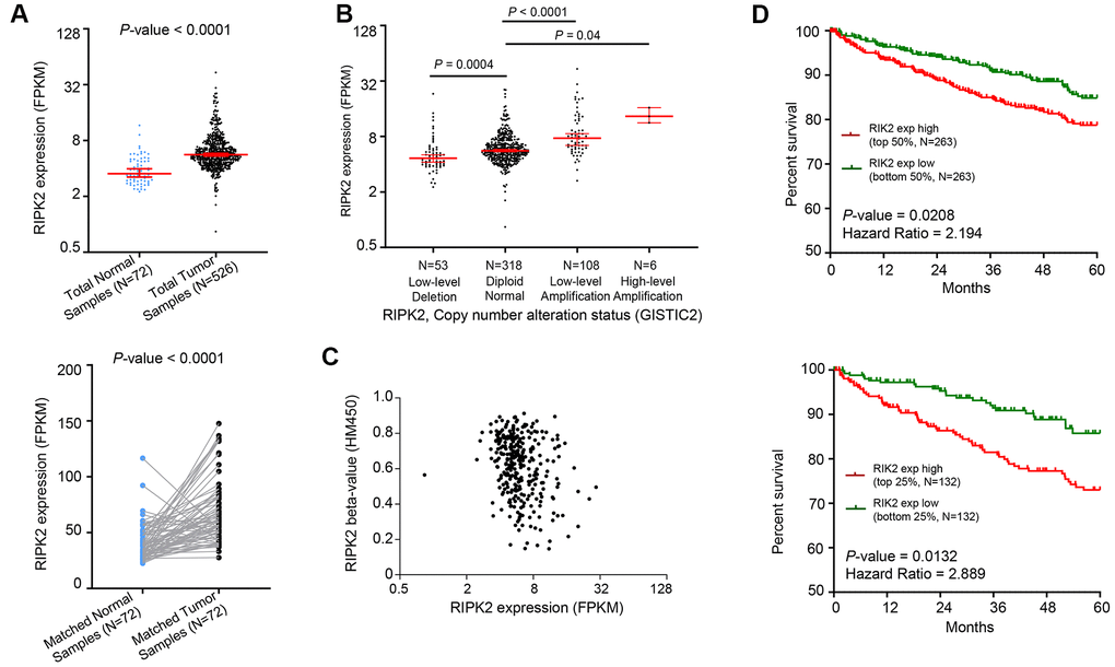 First, the mRNA expression value of RIPK2 was determined in KIRC samples based on RNA-sequencing data of the TCGA database. The results showed that the RIPK2 gene was dramatically higher expressed in KIRC tumor samples (N = 526) compared with normal tissues (N=72) (Figure 1A, top, log-scale). The over-expression trend of RIPK2 was also detected when compared with the matched tumor samples with adjacent normal samples (P < 0.0001) (Figure 1A, bottom, linear-scale). To further investigate whether the upregulation of RIPK2 is due to the gene copy number amplification or epigenetics change (like promoter demethylated), we interrogated the chromosomal segment to determine the copy number alterations of KIRC samples. The KIRC patients could be stratified into four sub-groups based on the copy number values of gene RIPK2 estimated by GISTIC2 algorithm (Low-level deletion sub-group, N = 64; Diploid sub-group, N = 389; Low-level amplification sub-group, N = 62; High-level amplification sub-group, N = 3) [12, 13]. The results revealed that about one-fifth of all KIRC samples harbored RIPK2 copy number amplification (Figure 1B), and consistently, exhibited higher gene expression value than those harboring diploid RIPK2. In addition, we did not find any association between the methylation level at the gene region of RIPK2 and its mRNA expression level (Figure 1C). Consequently, copy number gains of the gene RIPK2 was likely the key machinery that contributes to the overexpression in KIRC patients. Furthermore, the upregulation of RIPK2 was also confirmed at both protein level, while the phosphorylation level of RIPK2 that representing it activated state was also significantly increased in KIRC samples (Supplementary Figure 2, 3).